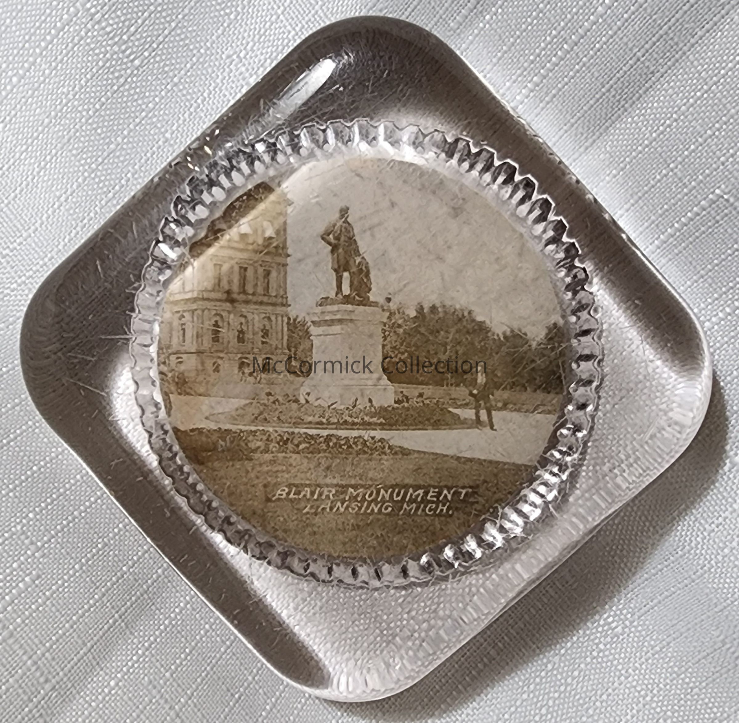 Glass square paperweight of the Governor Austin Blair Monument at the Michigan State Capitol in Lansing.