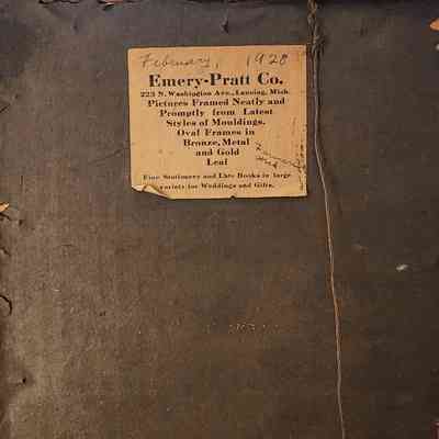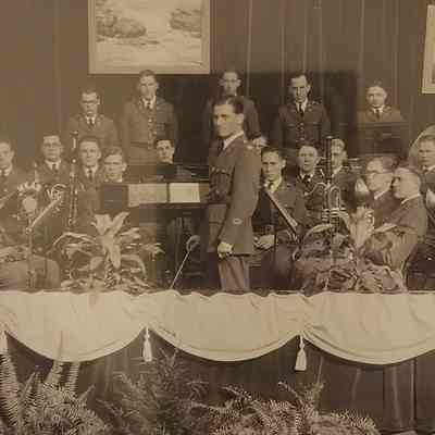 Framed photograph of the February 1928 Michigan State College Band directed by Leonard Falcone in his first year (1927-1928). Photo by Vans Photo. Framed by Lansing shop Emery Pratt.