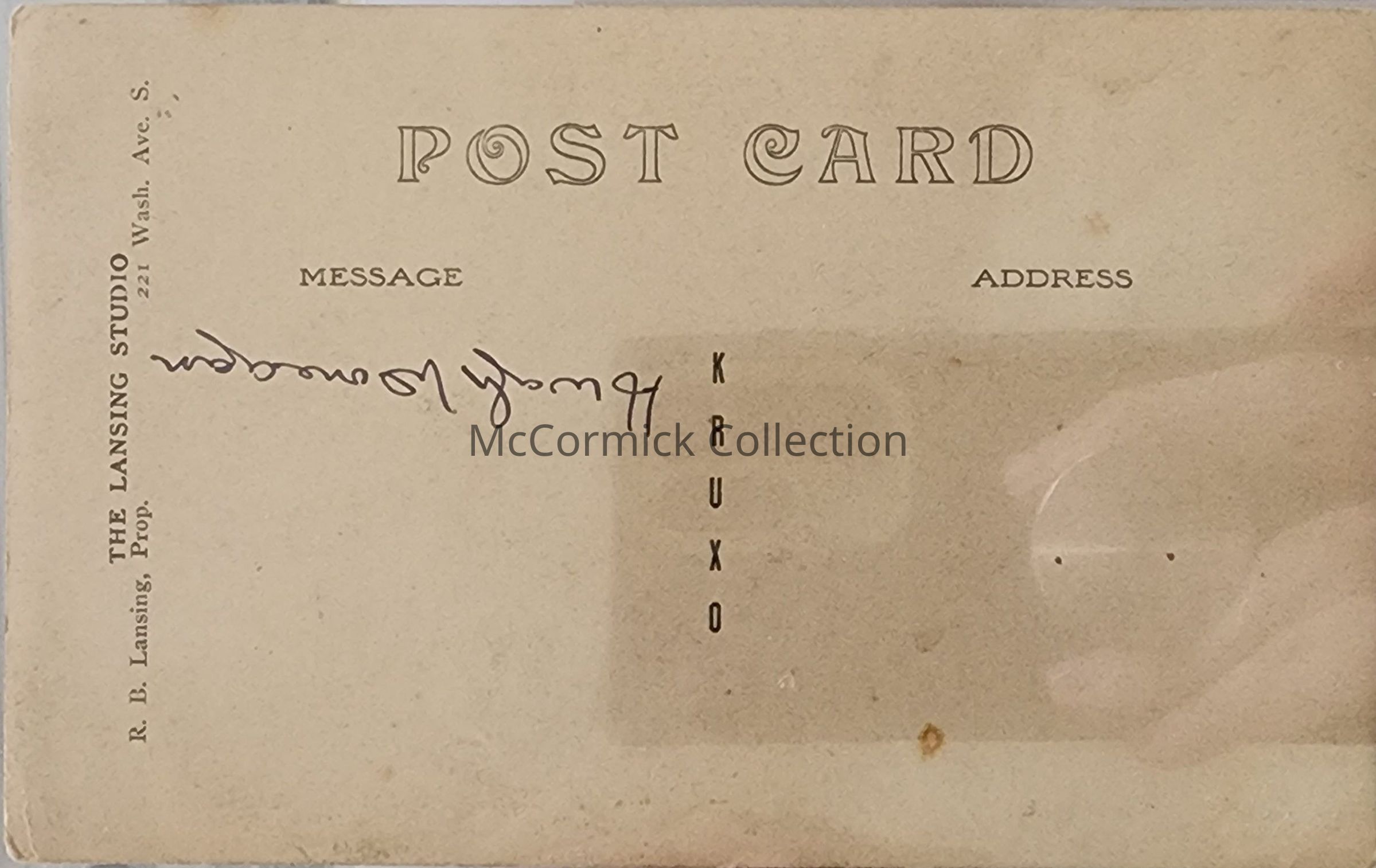 Real photo postcard of Hugh Wonegan in an automobile by Lansing photographer Lansing Studio.