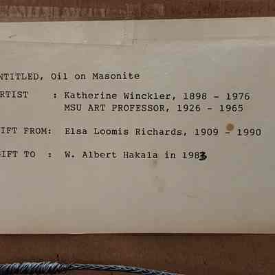 Untitled abstract oil on Masonite board by East Lansing artist Katherine Winckler (1898-1976), art professor at Michigan State College/University from 1926 to 1965. Winckler, together with fellow artist and MSC faculty Alma Goetsch, commissioned the Goetsch-Winckler House from Frank Lloyd Wright in Okemos, Michigan.