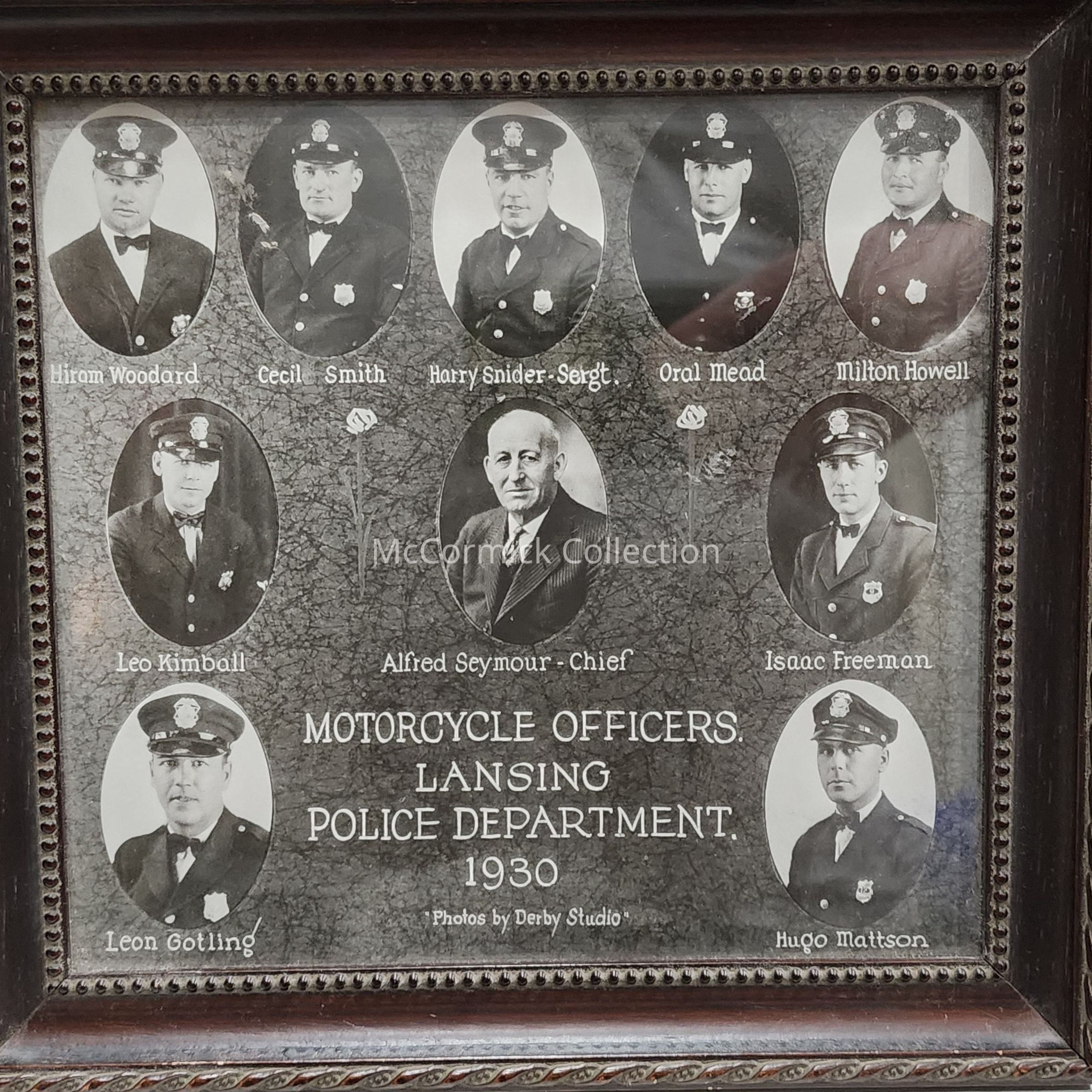 Composite photograph of Lansing Police Chief Alfred Seymour and the LPD Motorcycle Officers. Photo by Derby Studio of Lansing.