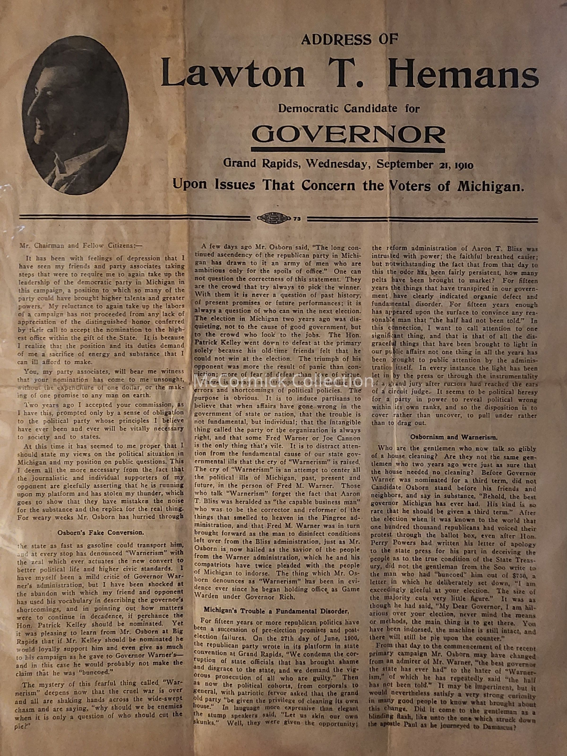 Address of Lawton T. Hemans, Democratic Candidate for Governor, Grand Rapids, Wednesday, September 21, 1910, Upon Issues that Concern the Voters of Michigan.