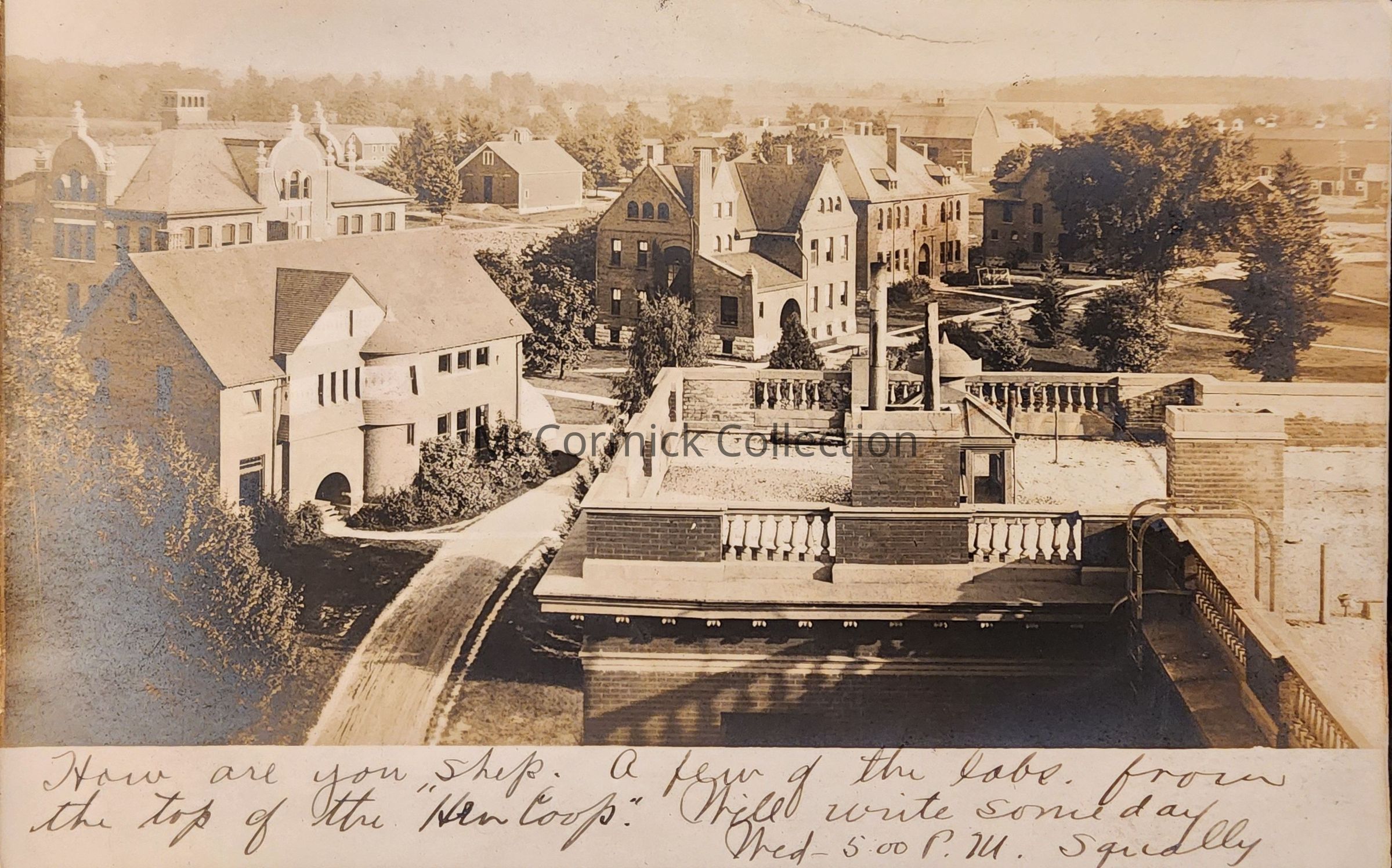 Shows the roof of the Women's Building (Morrill Hall), and laboratory row. Postmarked 1907 Agricultural College.