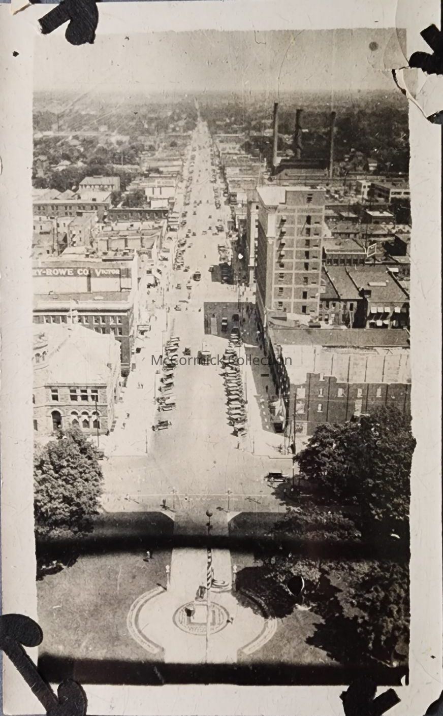Snapshot aerial photograph from the dome of the Michigan State Capitol facing east down Michigan Avenue. The Hotel Olds is under construction, circa 1920s.