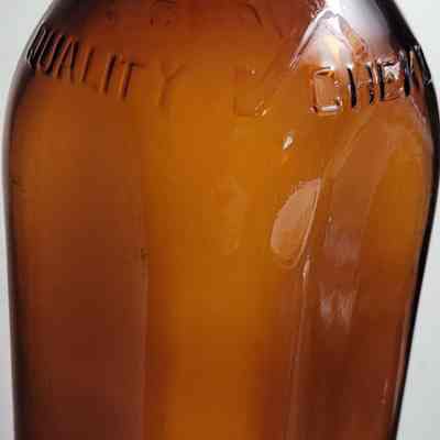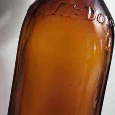 An amber embossed square quart bottle from McDonald Dairy with logo embossed on shoulder and "Quality Checkd" slogan on other side.