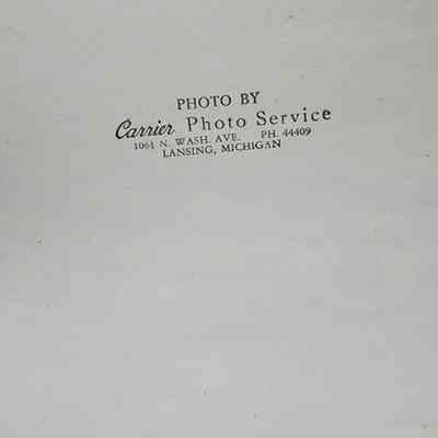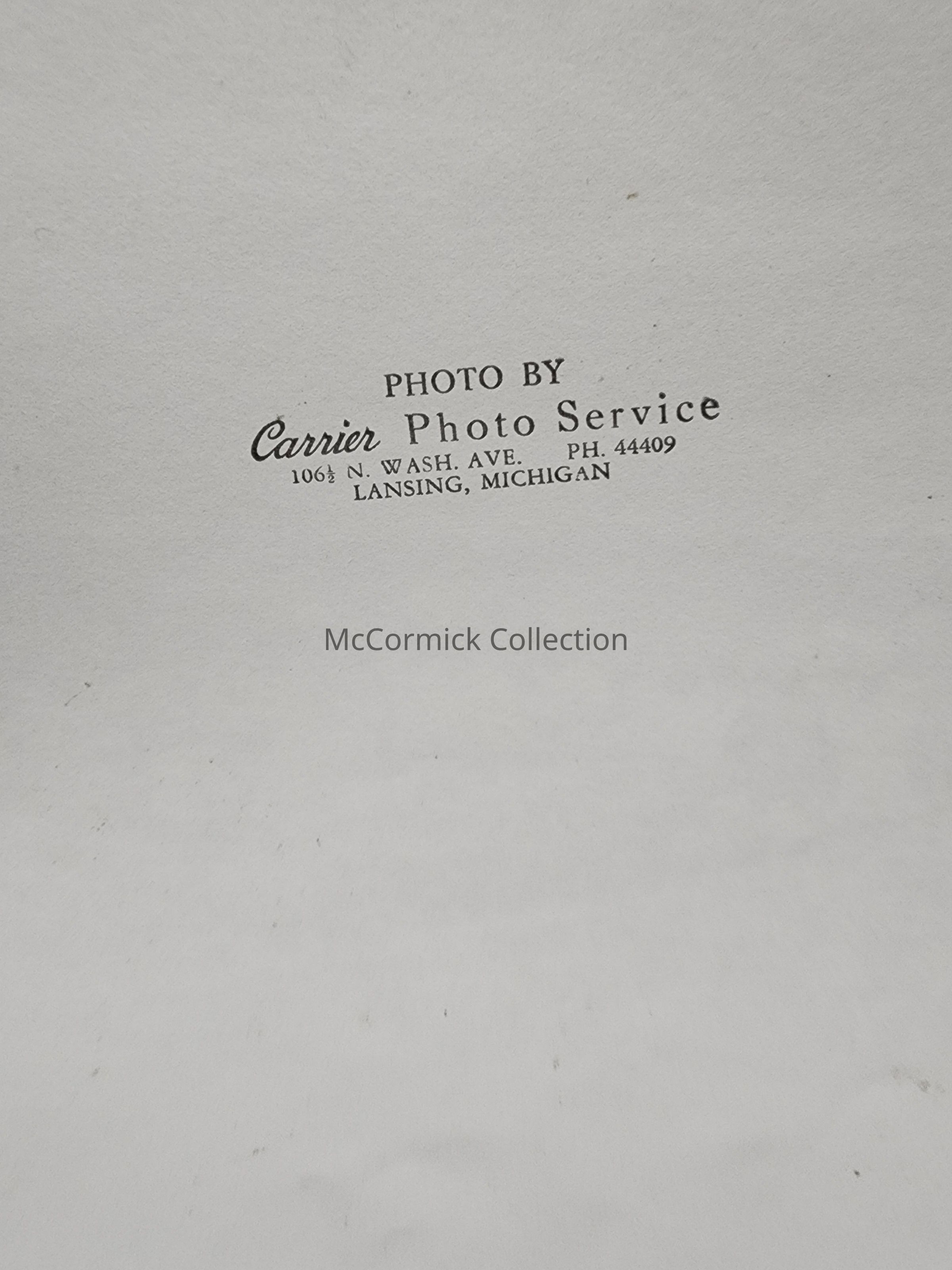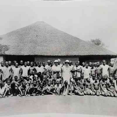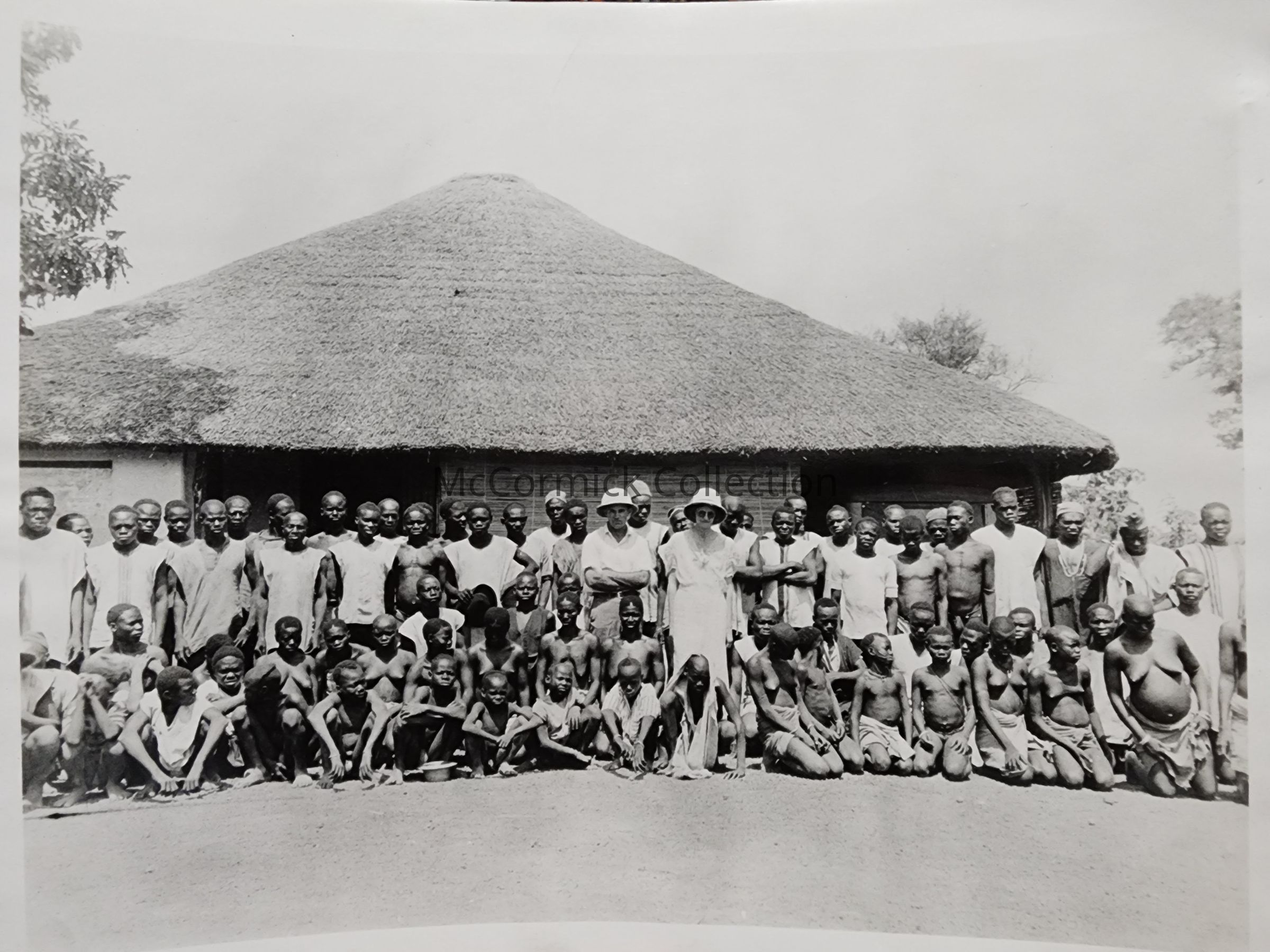 Photographic print of an unidentified white couple with a group likely in Africa, printed by Lansing photographer Carrier Photo Service.