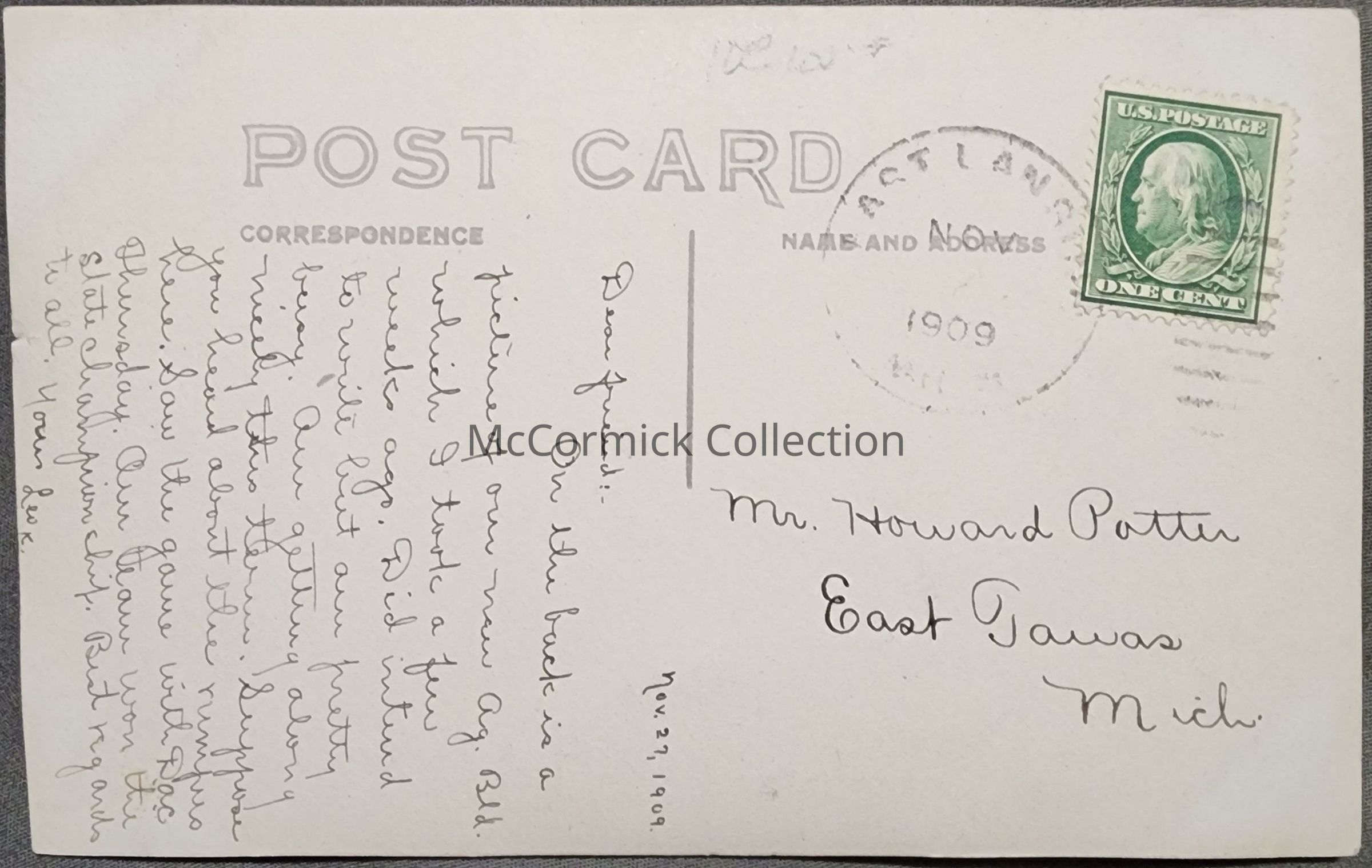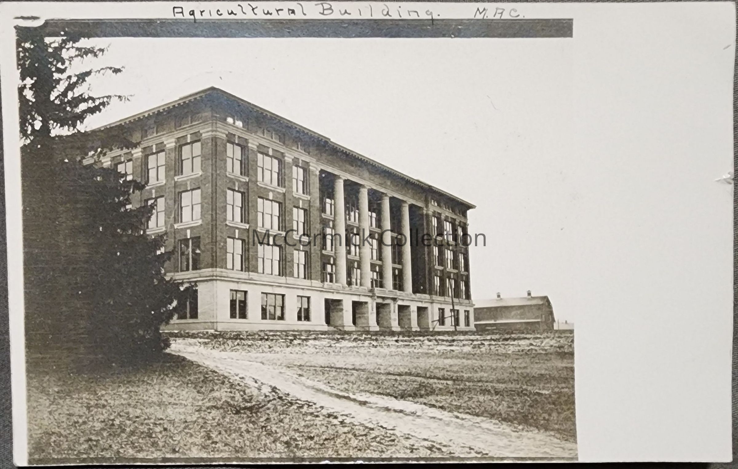Real photo postcard of the Agricultural Building (Agriculture Hall) at Michigan Agricultural College in East Lansing. Also shows the barns to the south. This is a snapshot photograph postcard and the photographer is unknown. Postmarked 1909.