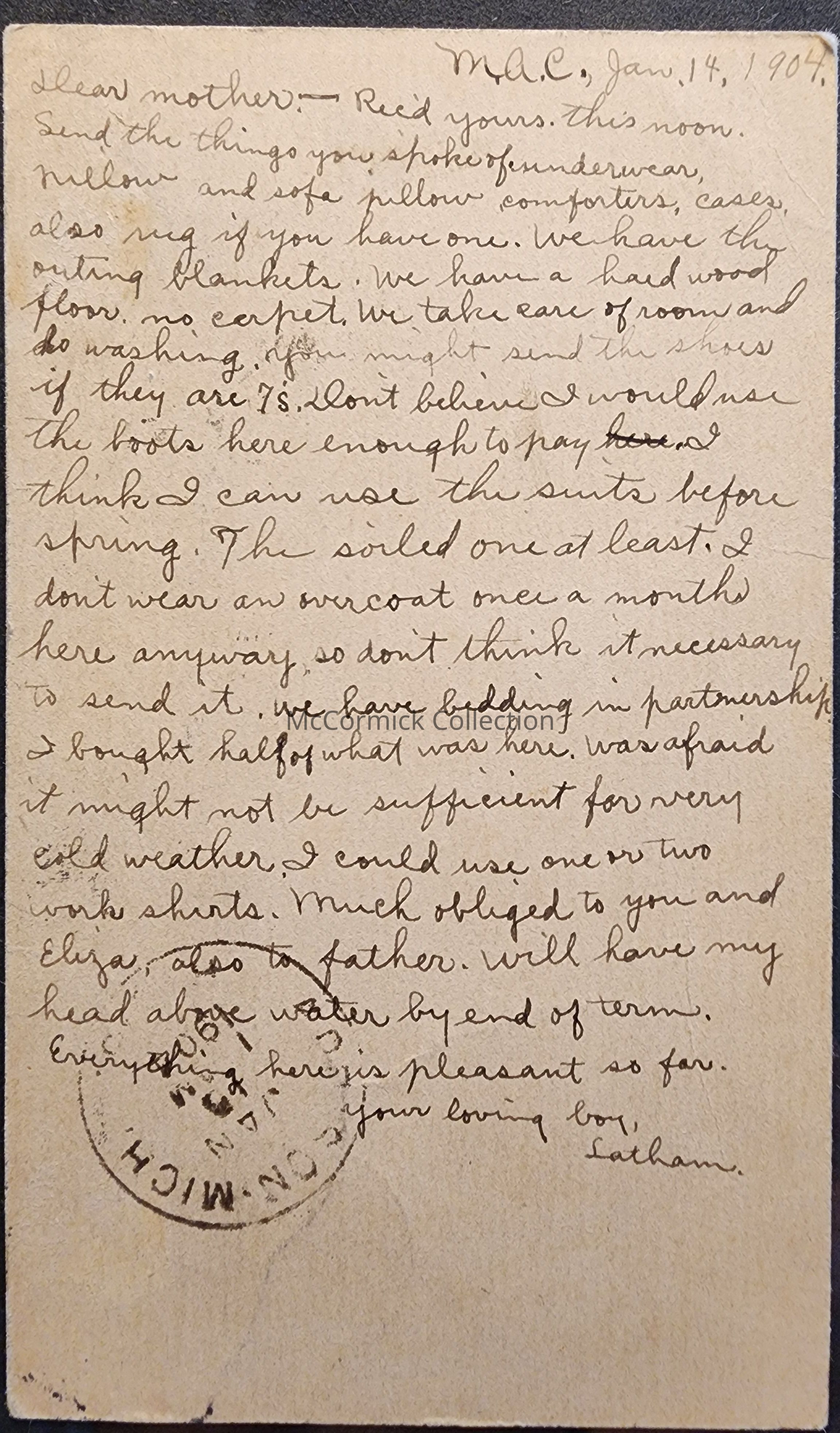 Agricultural College, Mich., 1904, Postal Card
