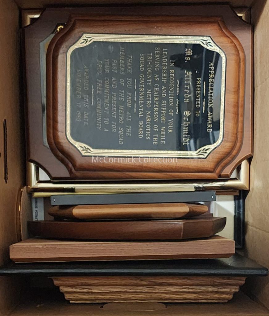 Includes 11 plaques and proclamations, photographs, papers, and political campaign memorabilia. Search "Alfreda Schmidt" to see some material cataloged separately.