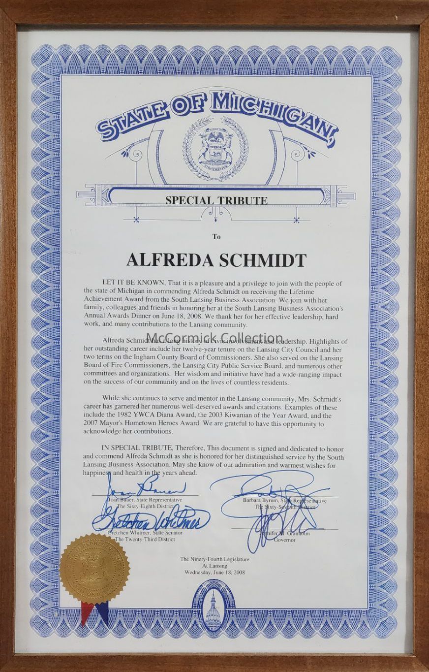Special Tribute to longtime Lansing political figure Alfreda Schmidt signed by Michigan Governor Jennifer Granholm, State Senator Gretchen Whitmer, State Representative Joan Bauer, and State Representative Barb Byrum. Dated 2008.