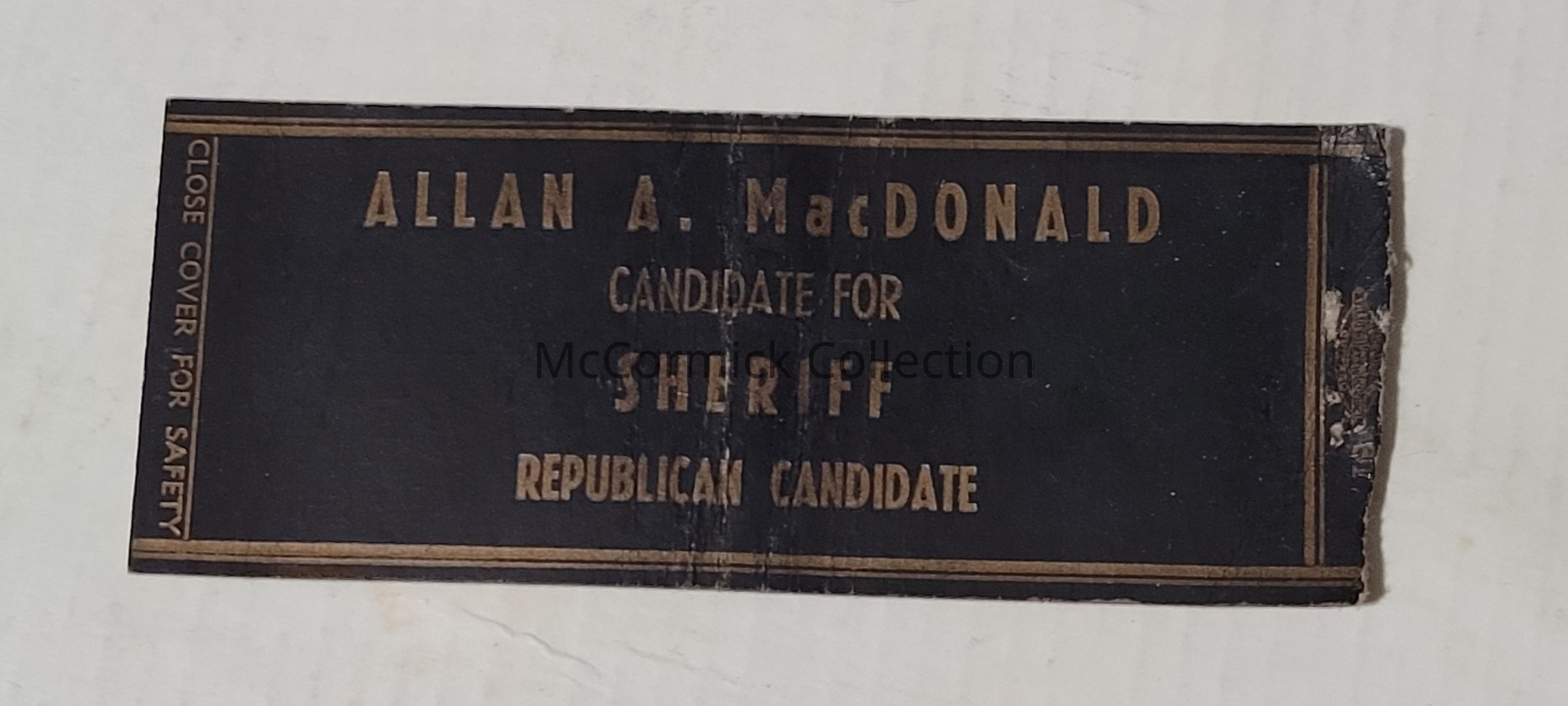 A black and gold political matchbook cover for Allan A. MacDonald, Candidate for Sheriff of Ingham County, Republican. Circa 1935.