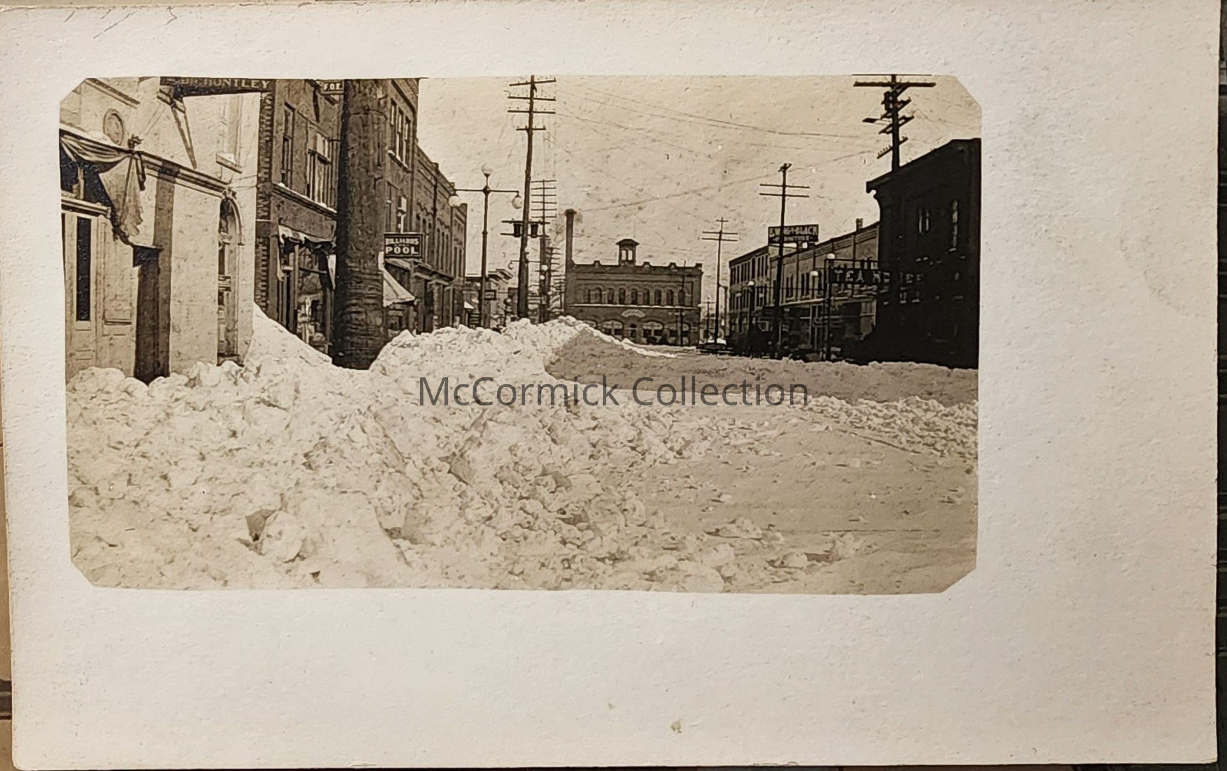 Real photo postcard of a snow and winter scene facing east down Allegan Street from Washington Avenue. At the foot of the street is Central Fire Station. A Billiards Pool Hall is shown on the left. Postally unused.