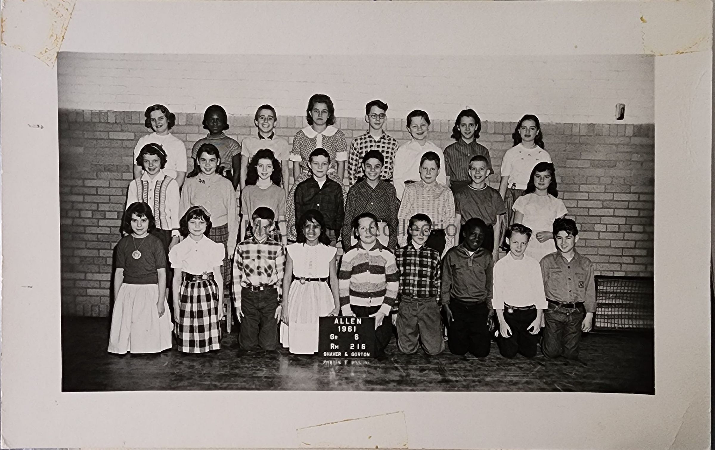 Real photo postcard of the Allen School Sixth Grade Class in 1961 by Lansing photographer Shaver and Gorton.
