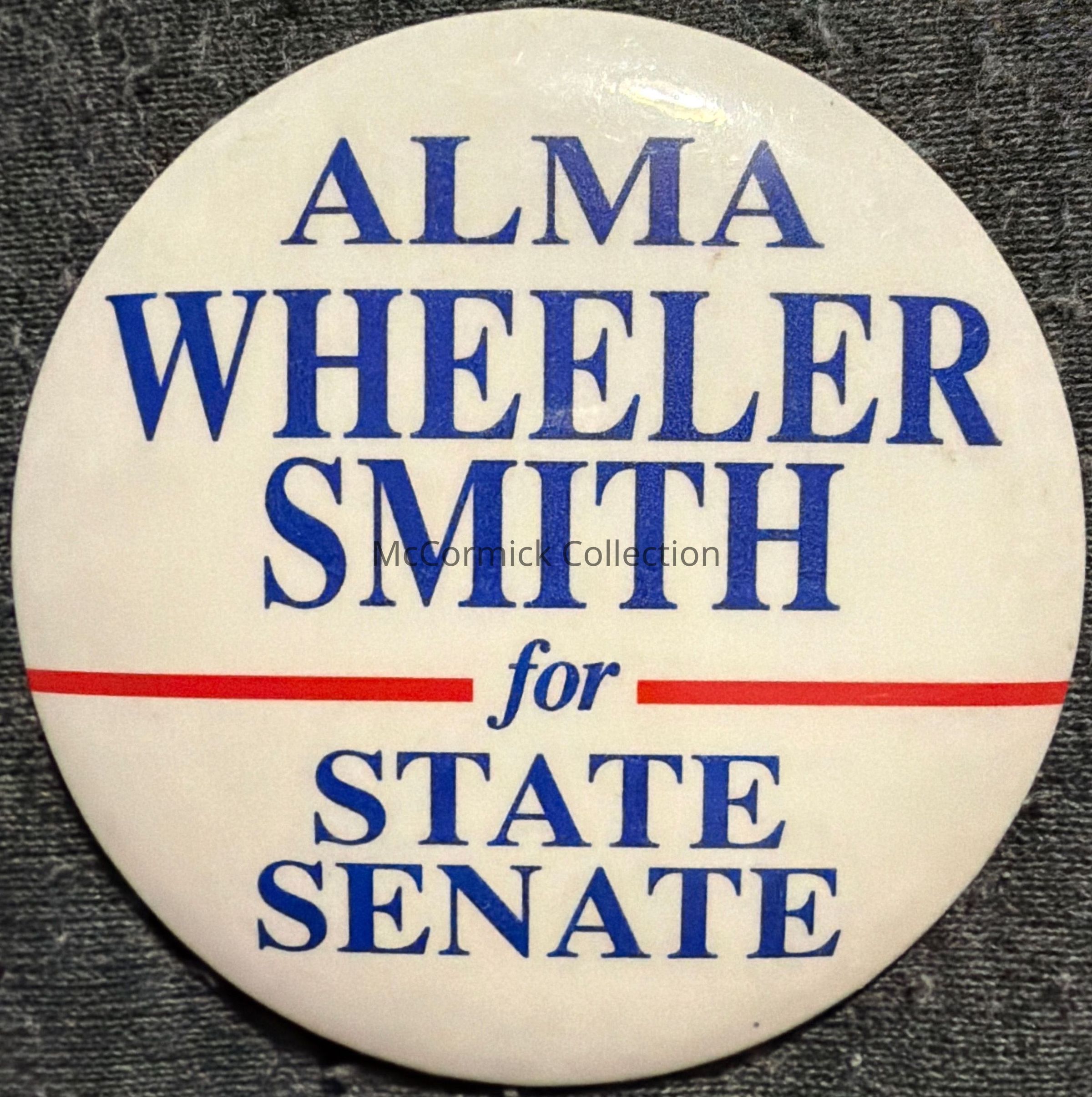 A 2.25” red, white, and blue political button for Alma Wheeler Smith for State Senate.