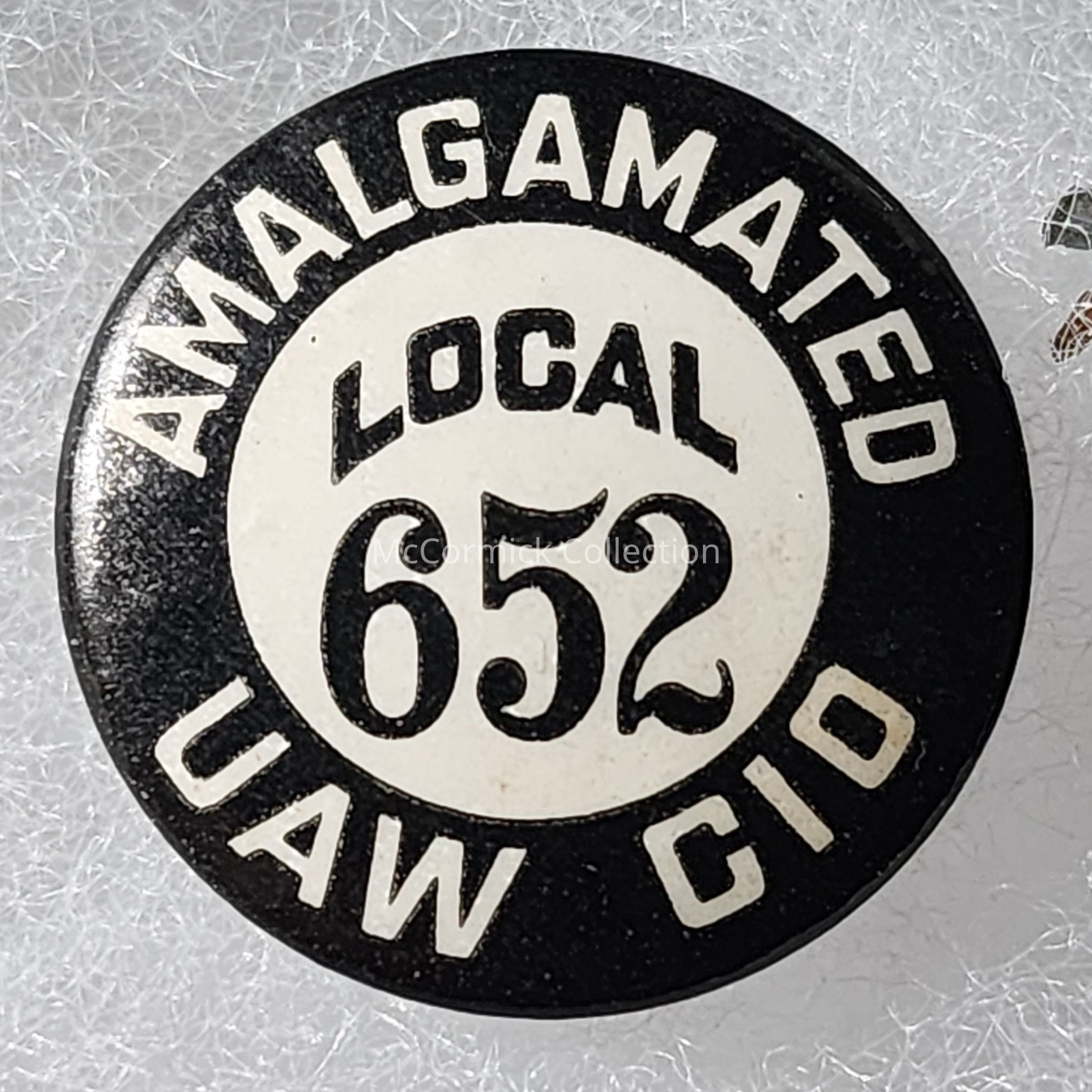 A 1" black and white button for Amalgamated UAW CIO Local 652 of Lansing, Michigan.