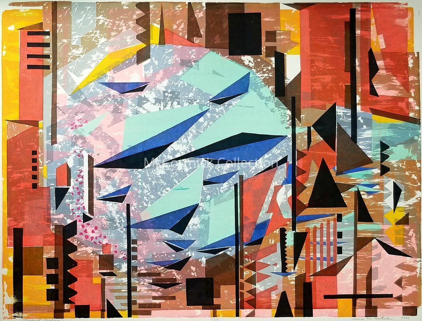 "Ancient Origins" serigraph silkscreen by MSC/MSU art professor Alma Goetsch, dated 1961, and numbered 11/14. Goetsch along with fellow artist and MSC faculty member Katherine Winckler commissioned a house by Frank Lloyd Wright in Okemos, Michigan.
