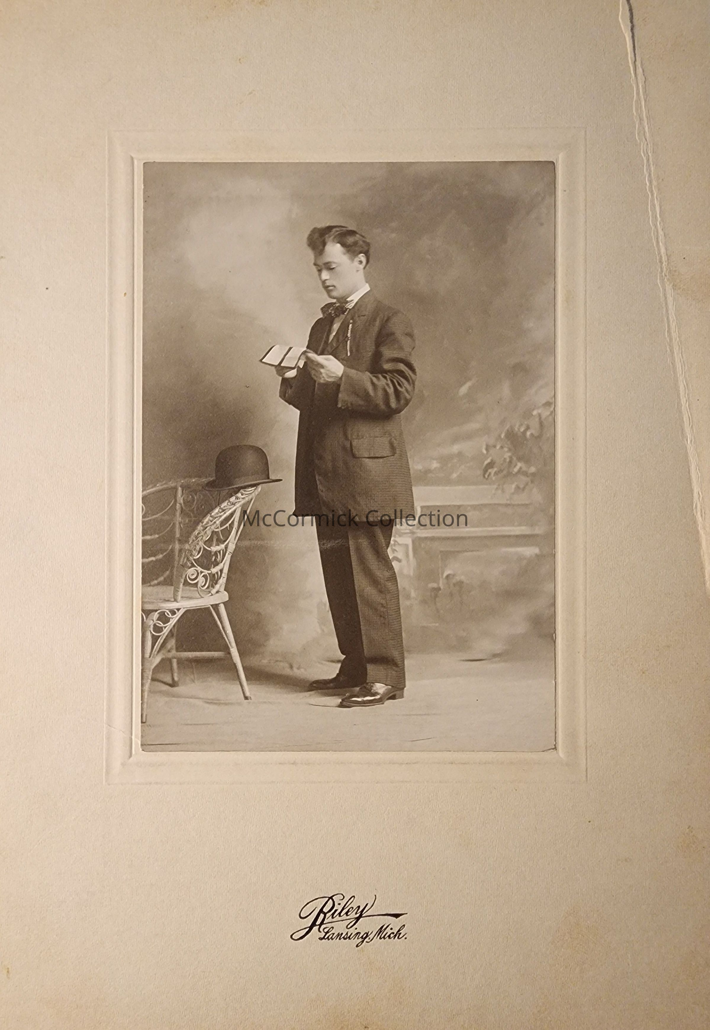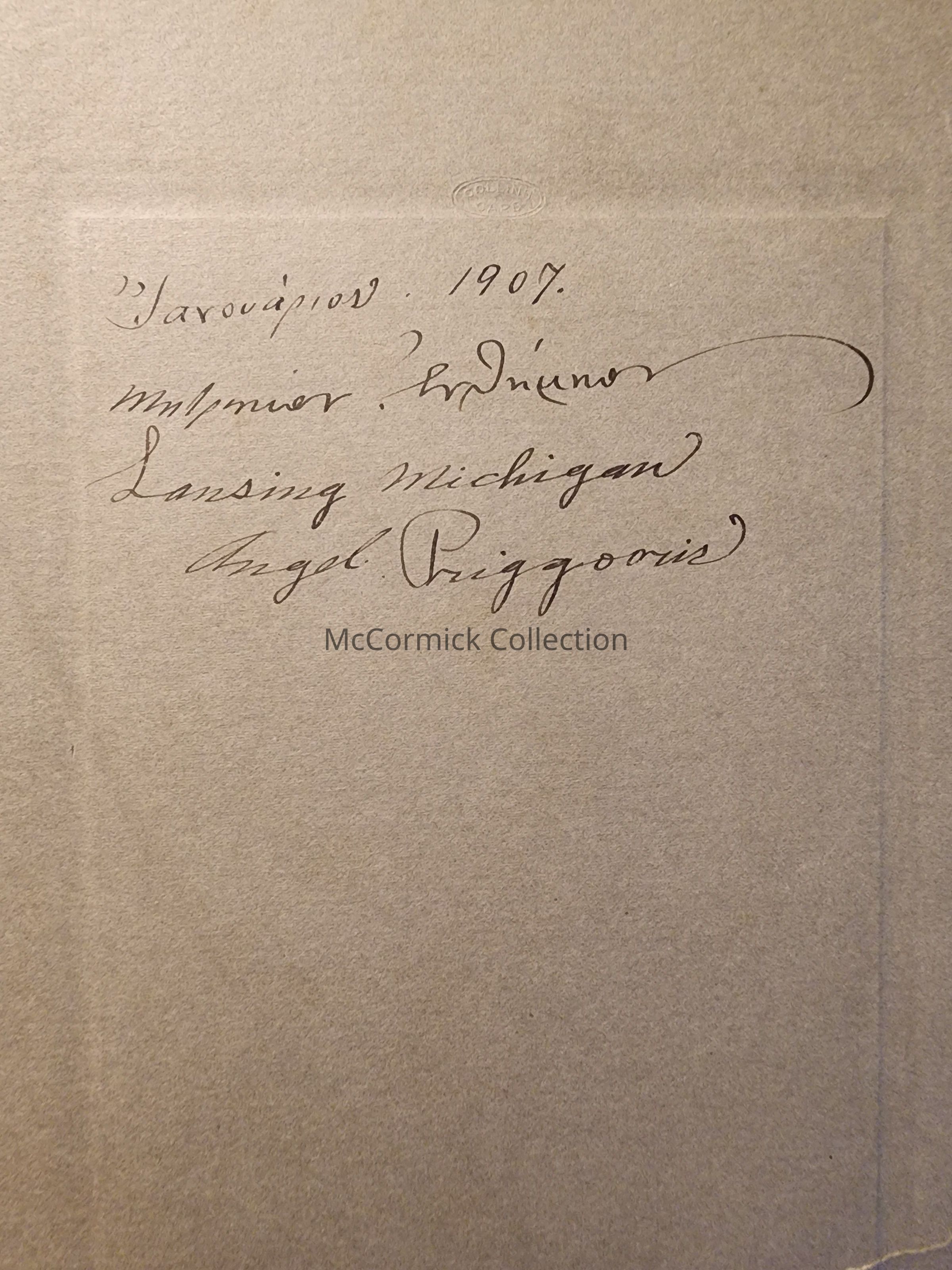 Card mounted photograph of Greek immigrant Angel Priggooris taken in 1907 by Lansing photographer Riley.
