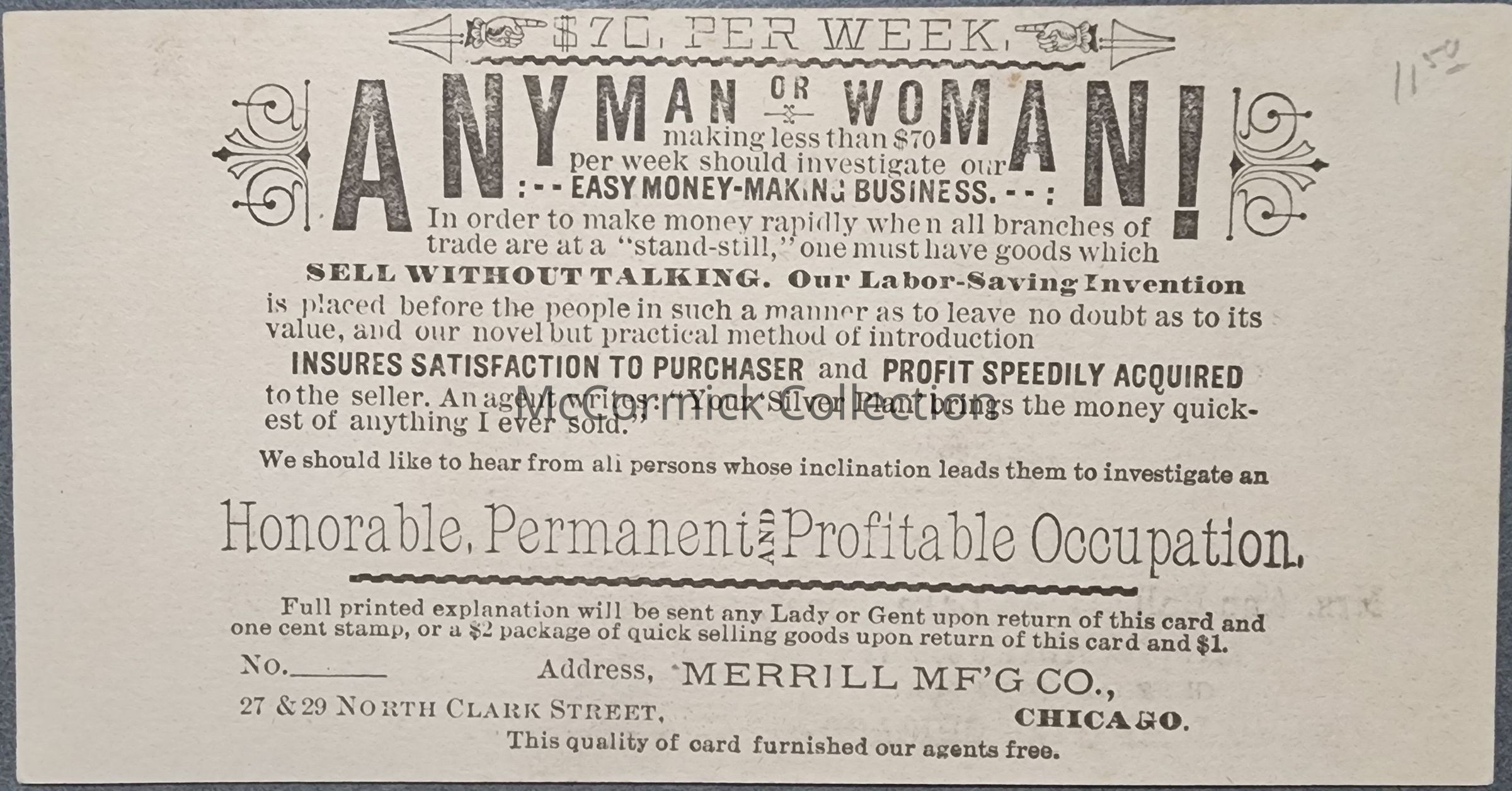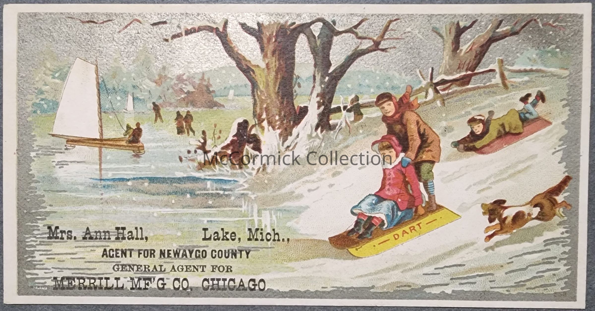 Advertising trade card for Mrs. Ann Hall of Lake, Mich., Agent for Newaygo County Merrill Mfg. Co. of Chicago.