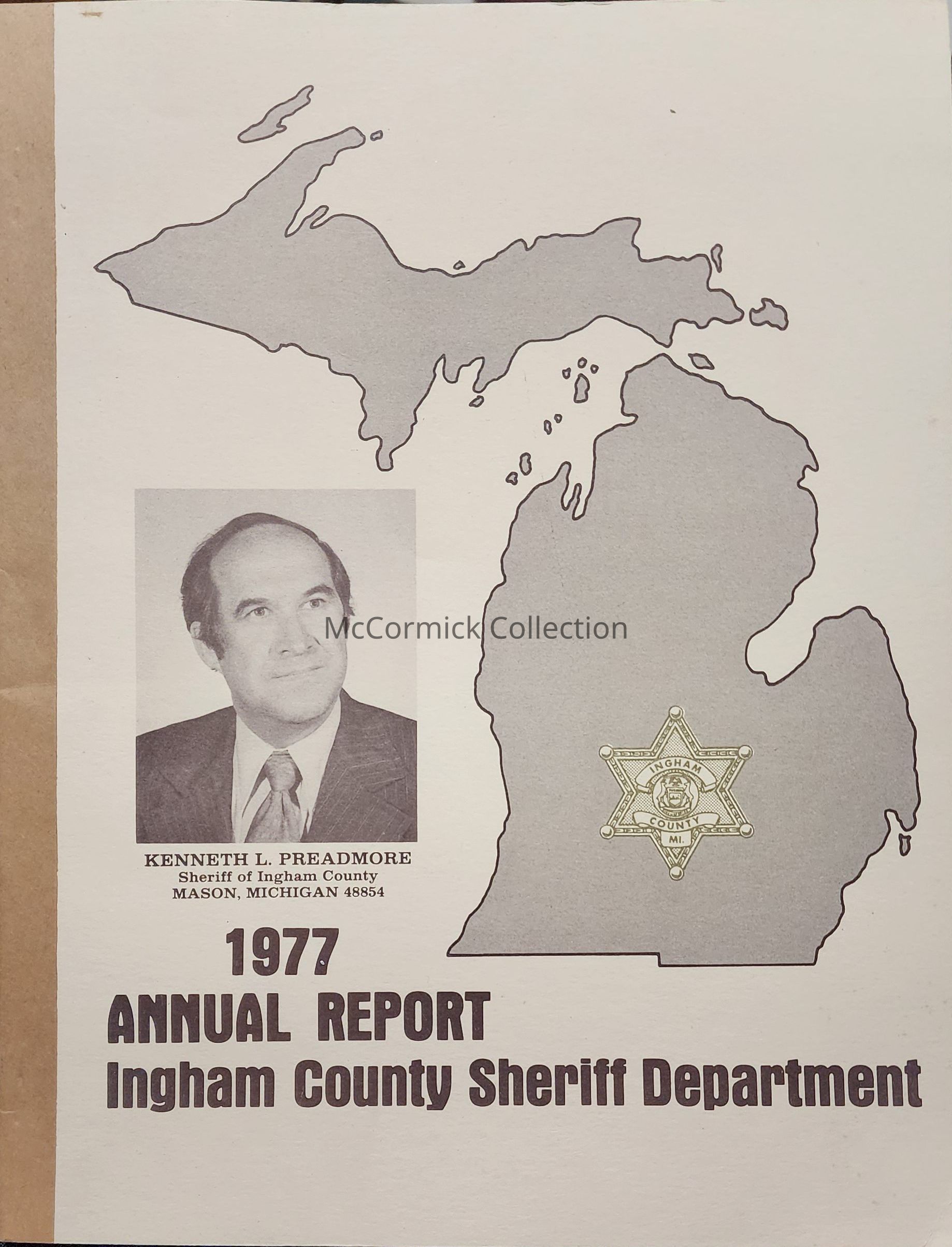1977 Annual Report of the Ingham County Sheriff's Department by Sheriff Kenneth Preadmore. Acquired from the Preadmore Estate.