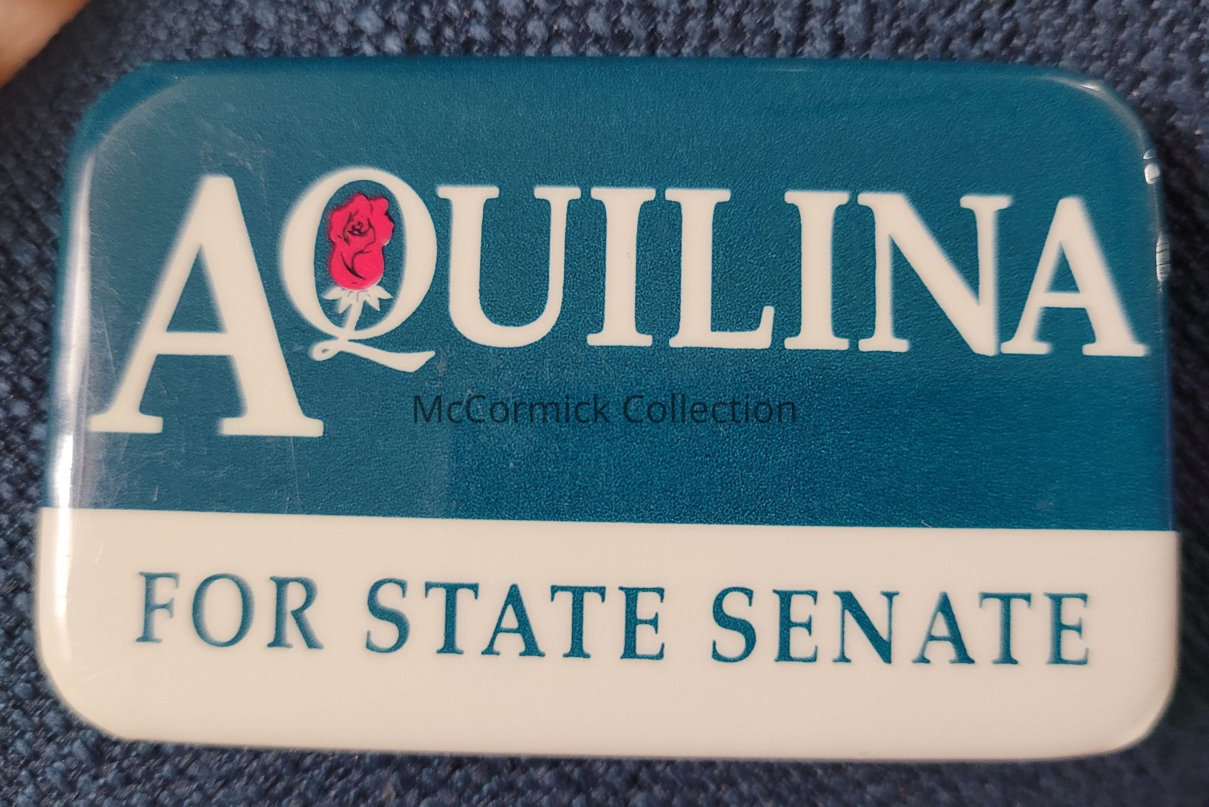 Rectangular political button for a Senatorial campaign of Rosemarie Aquilina for State Senate. Aquilina was the judge in the infamous Larry Nassar case in Ingham County, Michigan in the 2010s.