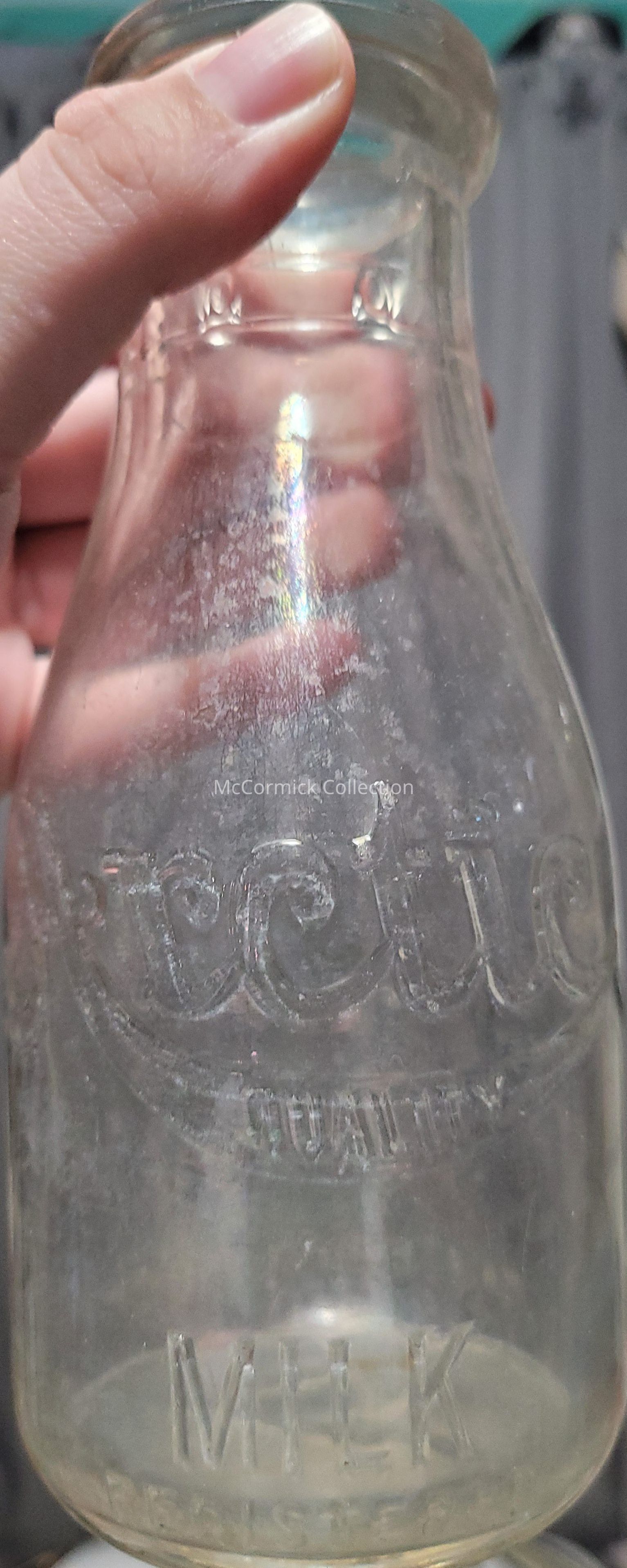 An embossed round pint botte from the Arctic Dairy of Lansing, Michigan, with script logo.