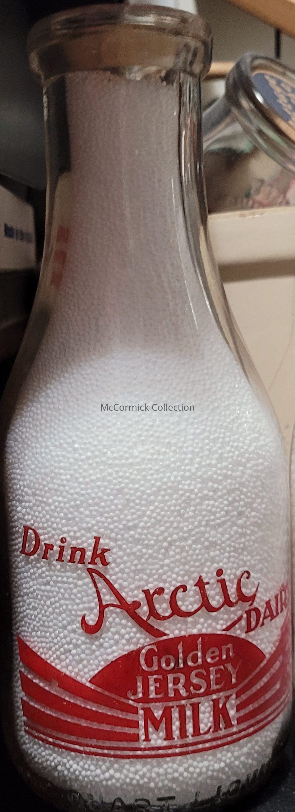 A red pyro tall neck round quart bottle from the Arctic Dairy of Lansing, Michigan.