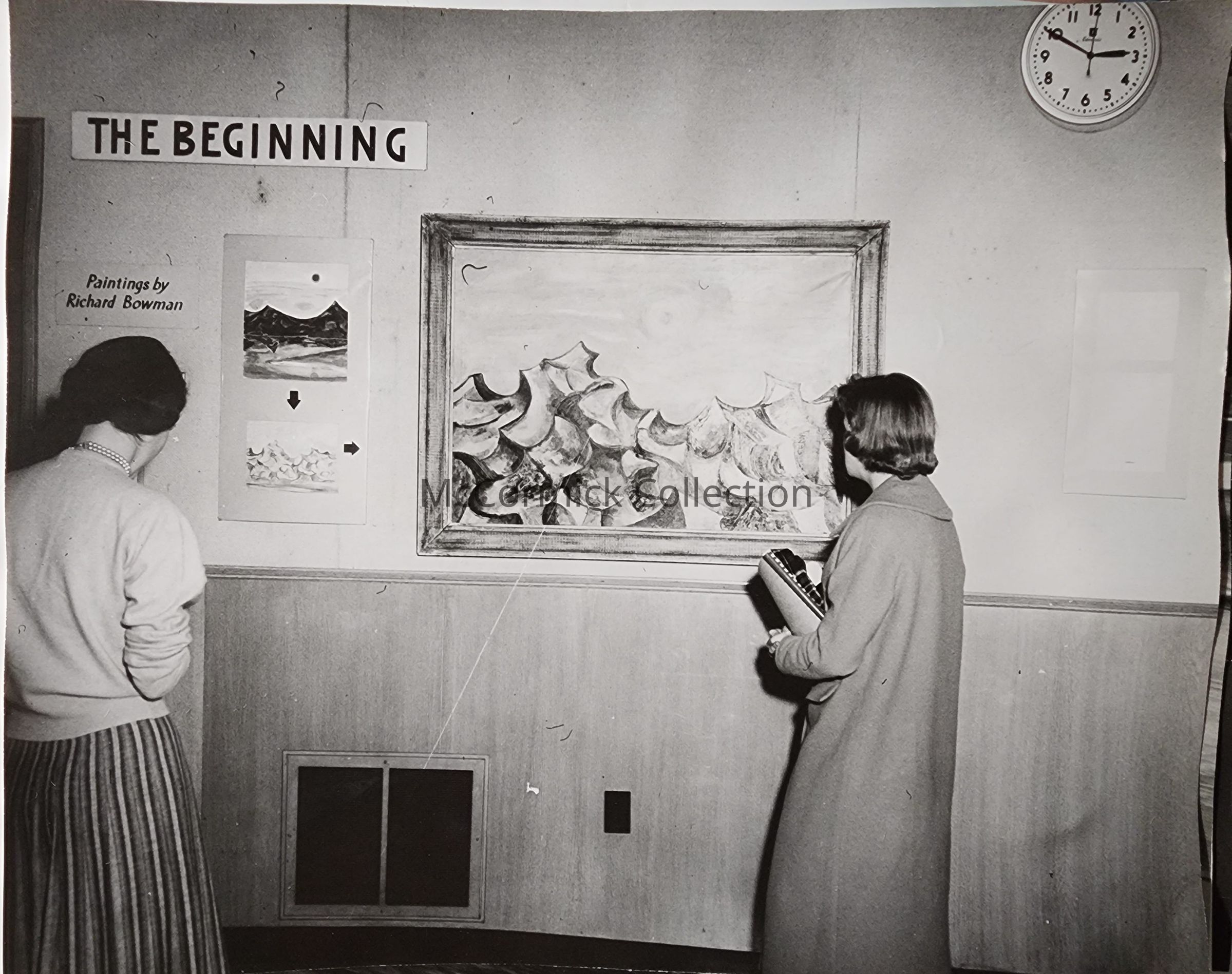 Snapshot photograph of an art show labeled "The Beginning" and "Paintings by Richard Bowman." It shows two women looking at Paintings. Maybe taken at Michigan State University. Circa 1950-60s.
