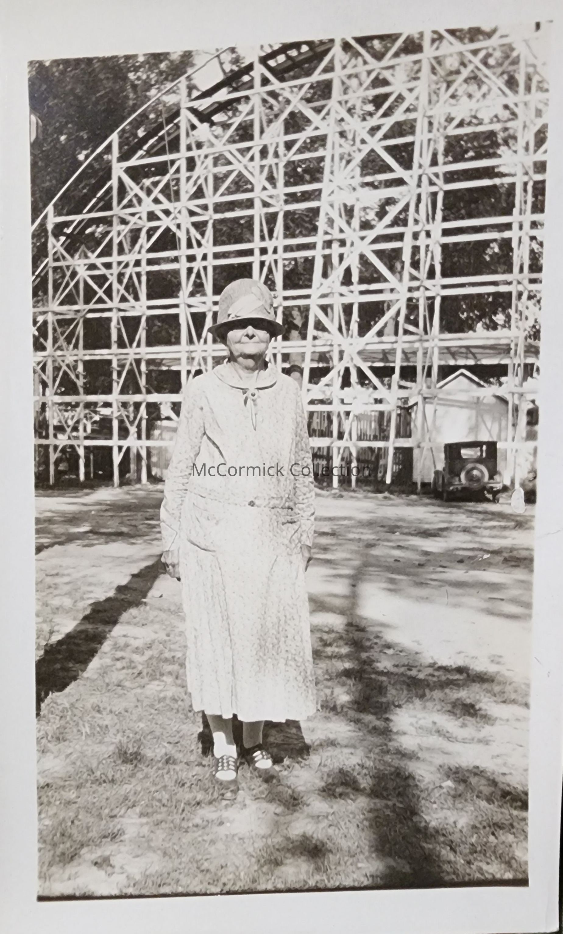 Snapshot photograph of a Woman identified as Aunt Anne, at the Pine Lake (later Lake Lansing) amusement park in Haslett, Michigan. Shown in front of the rollercoaster.