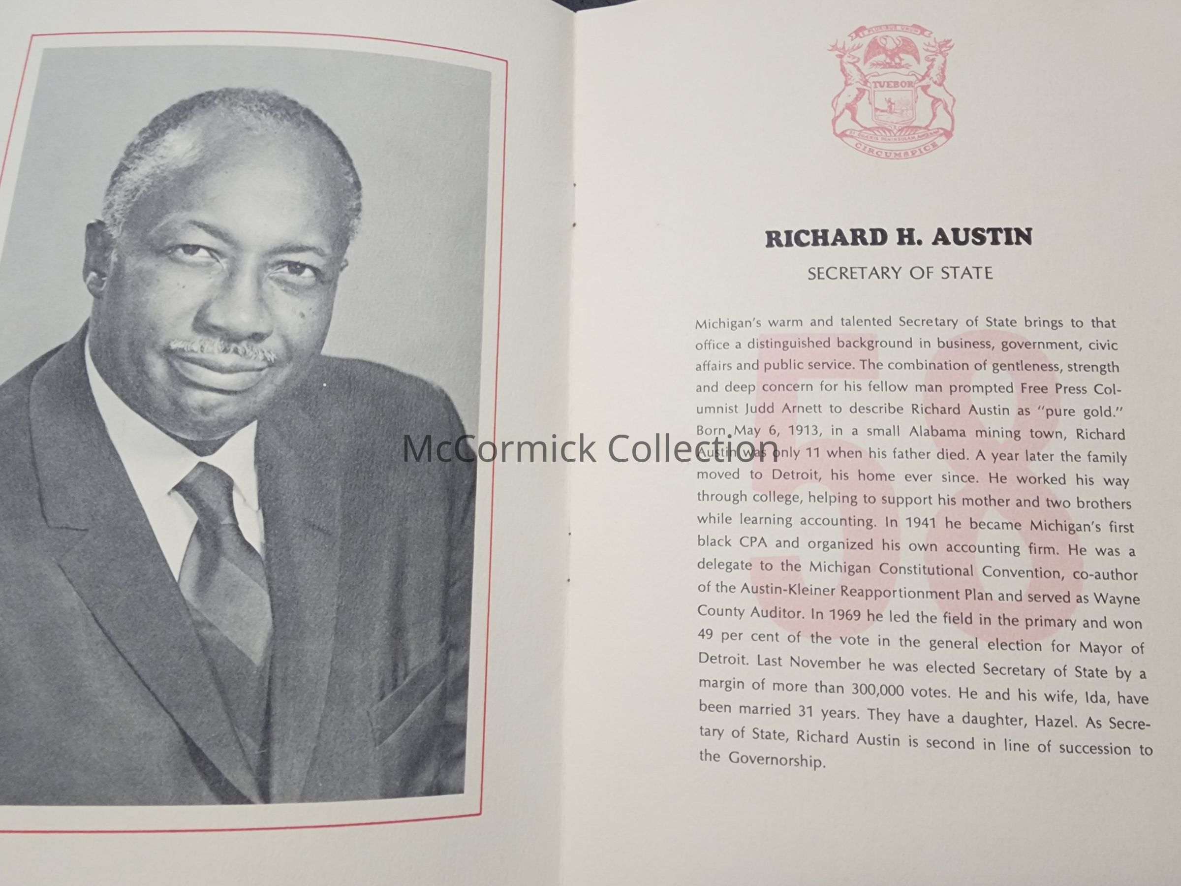 A signed 1971 program from a birthday dinner for Michigan Secretary of State Richard H. Austin. Signed by Austin, Phil Hart, and one other unidentified signature.