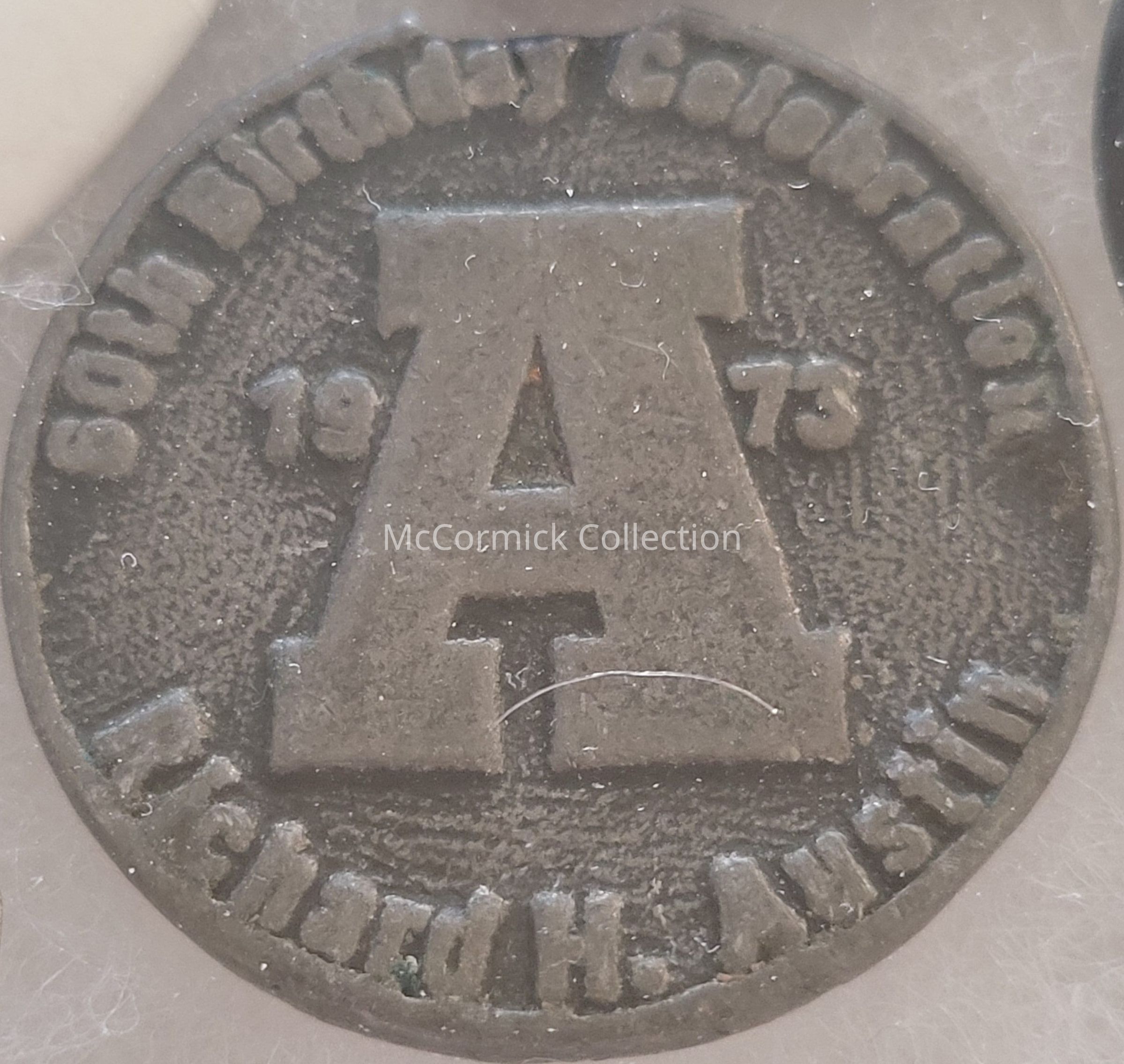 A metal token from Richard H. Austin's 1973 60th birthday celebration.