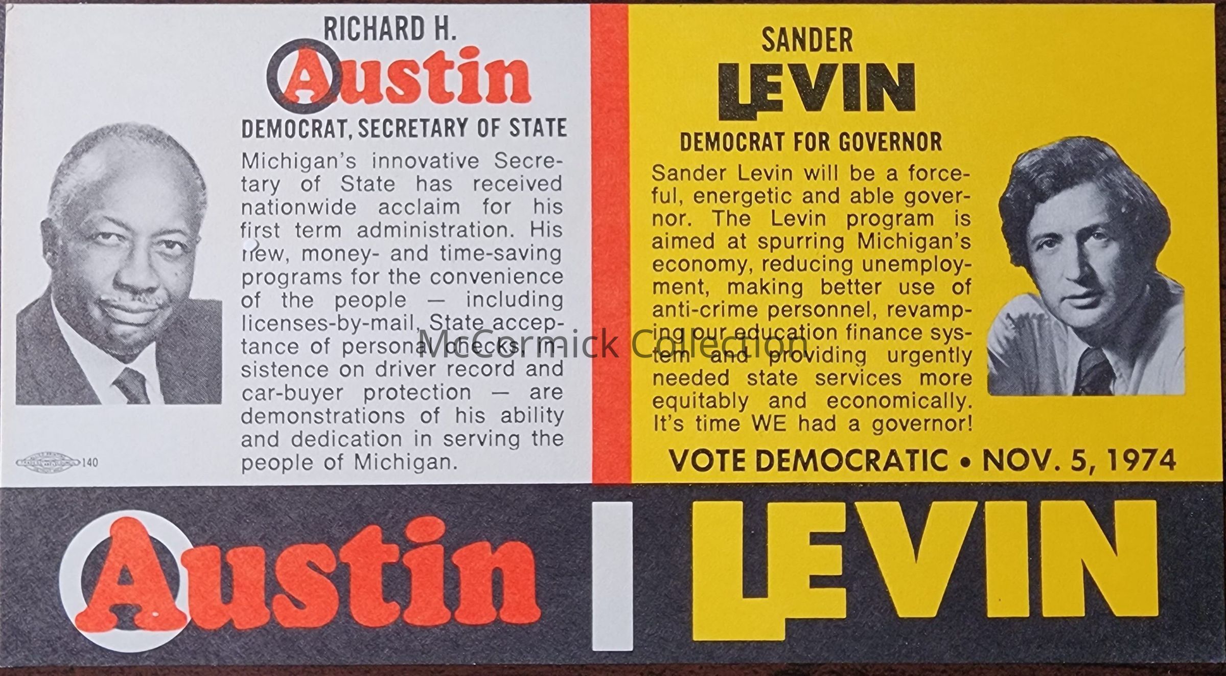 A coattail card for Richard H. Austin and Sander Levin, circa 1974.