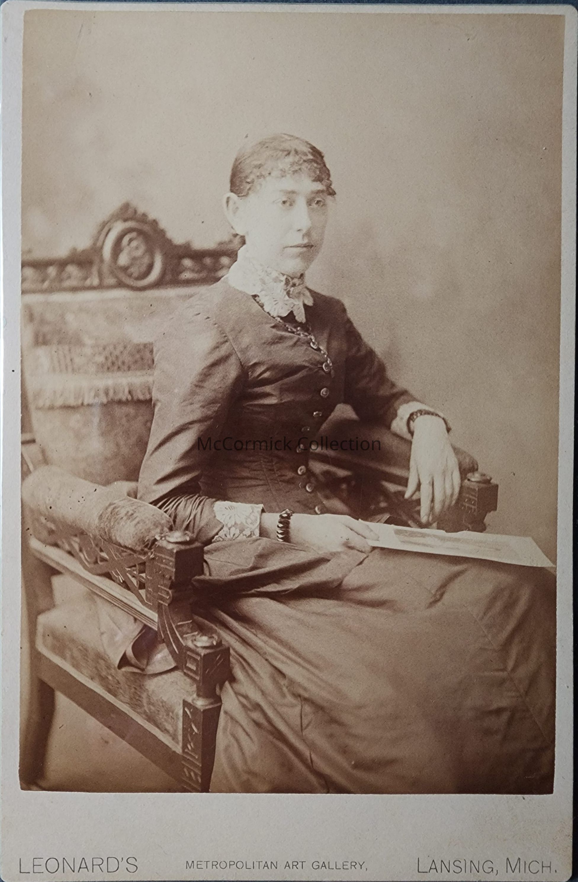 Cabinet card photograph of Ayres Emma Snyder (sic) by Lansing photographer Leonard's Metropolitan Art Gallery.Made/Created