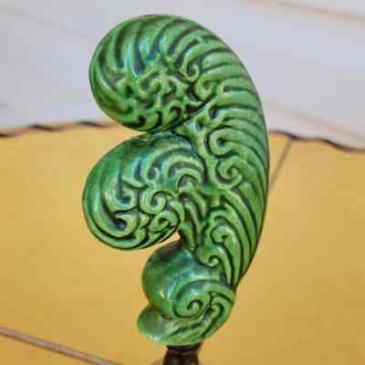 A pair of green and white ceramic lamps in the shape of a Spartan helmet. Unknown if mass produced or home made ceramics. Circa 1960s-70s. Have matching finials and fiberglas drum lampshades.