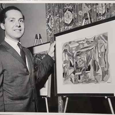 Press photograph of State Representative Jack Faxon posing with some of his abstract art in October 1965. Photo by Ed Haun of the Detroit Free Press.