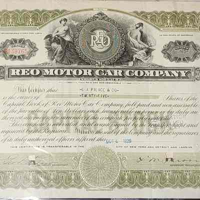 A 1929 capital stock certificate for the REO Motor Car Co., of Lansing for 25 shares of E.A. Pierce.