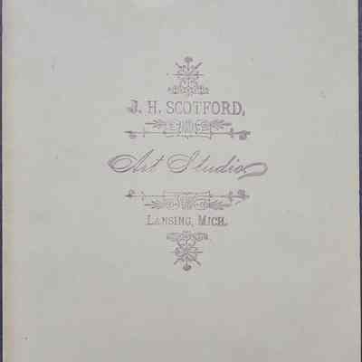 Cabinet card photograph of an unknown man studying with a foot stool in the studio by Lansing photographer John Harvey Scotford. Circa 1877-81.Made/Created