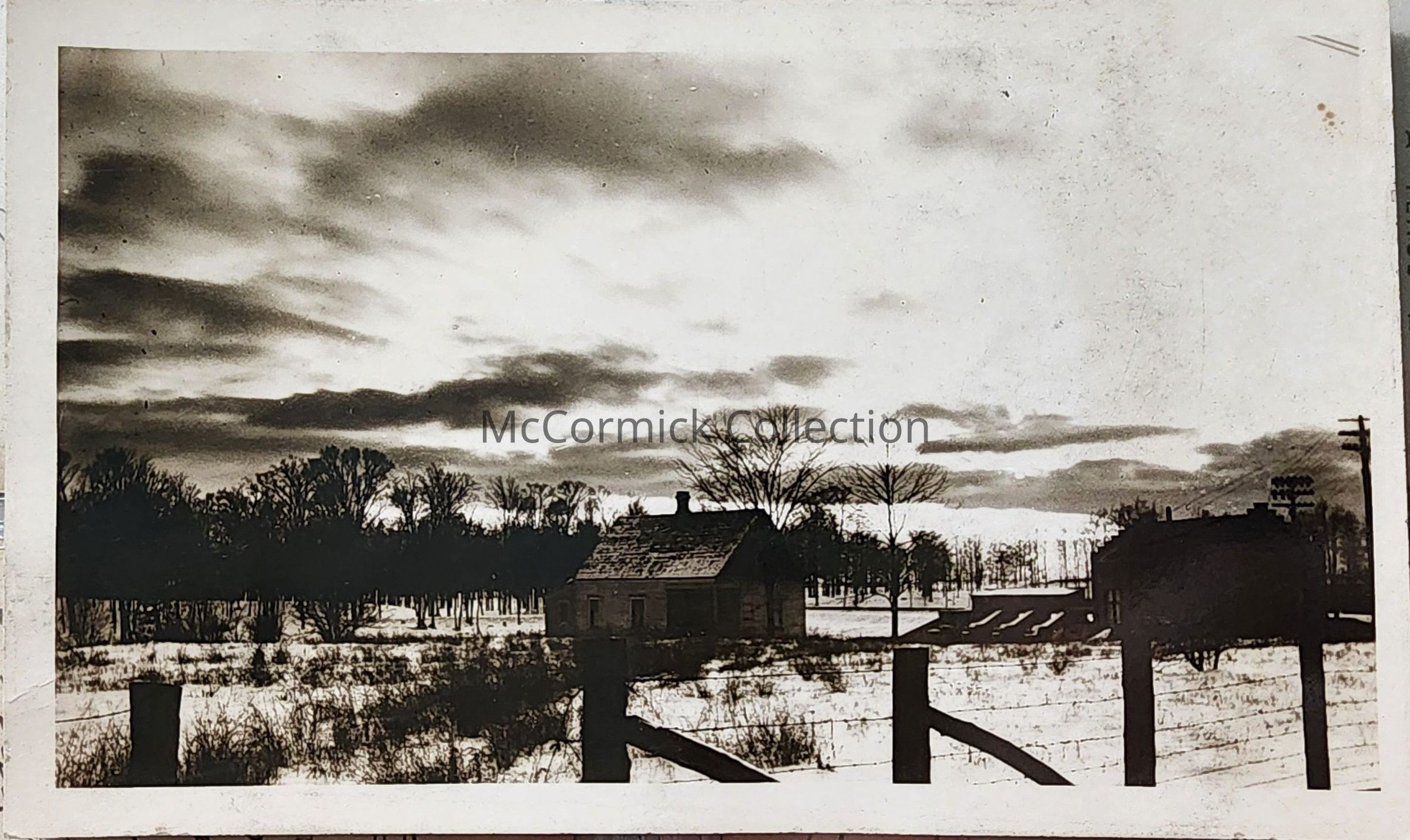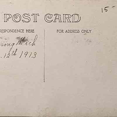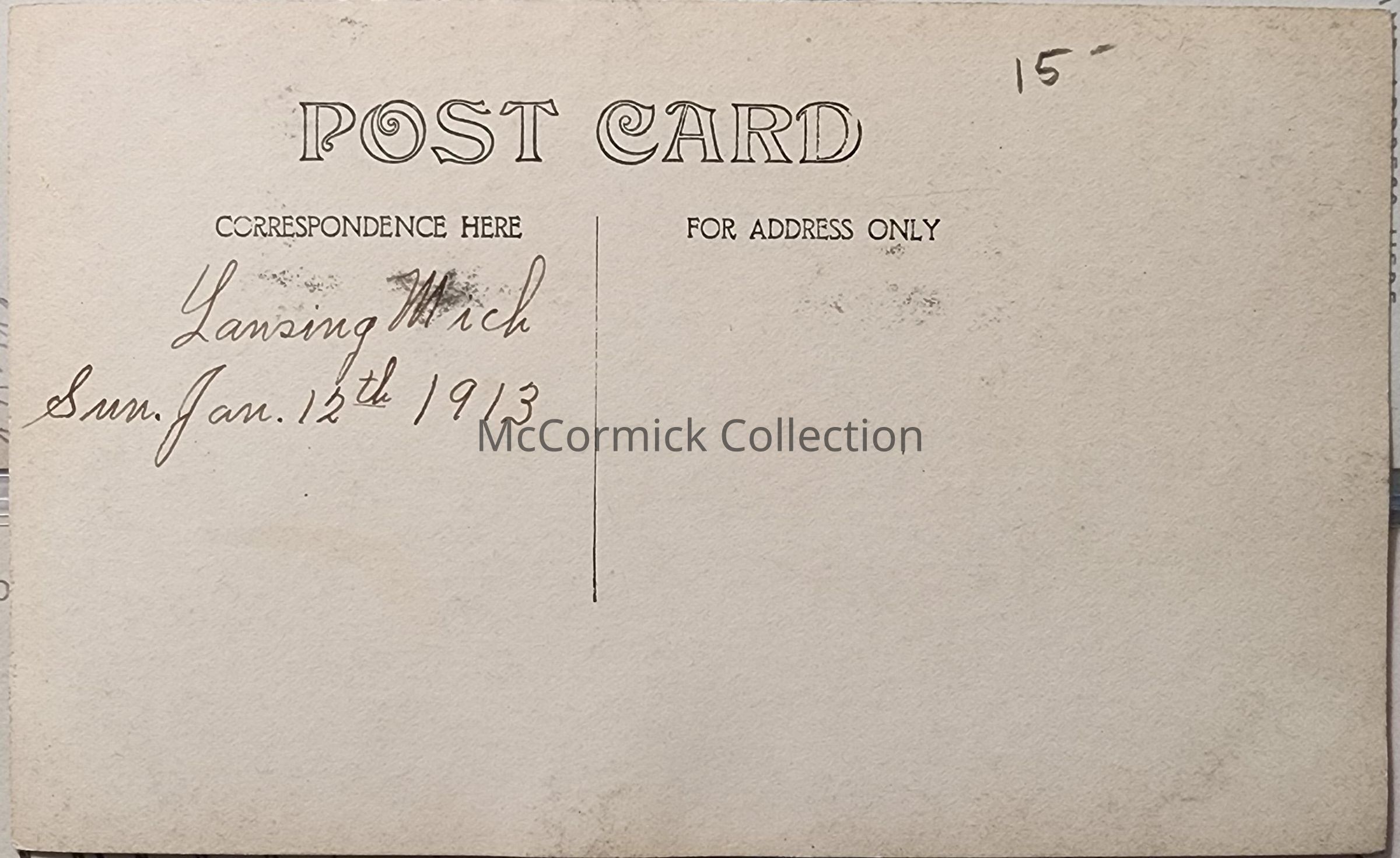 Real photo postcard of a field and what looks like a dam to the right in Lansing, Michigan. Postally unused. Dated 1914.