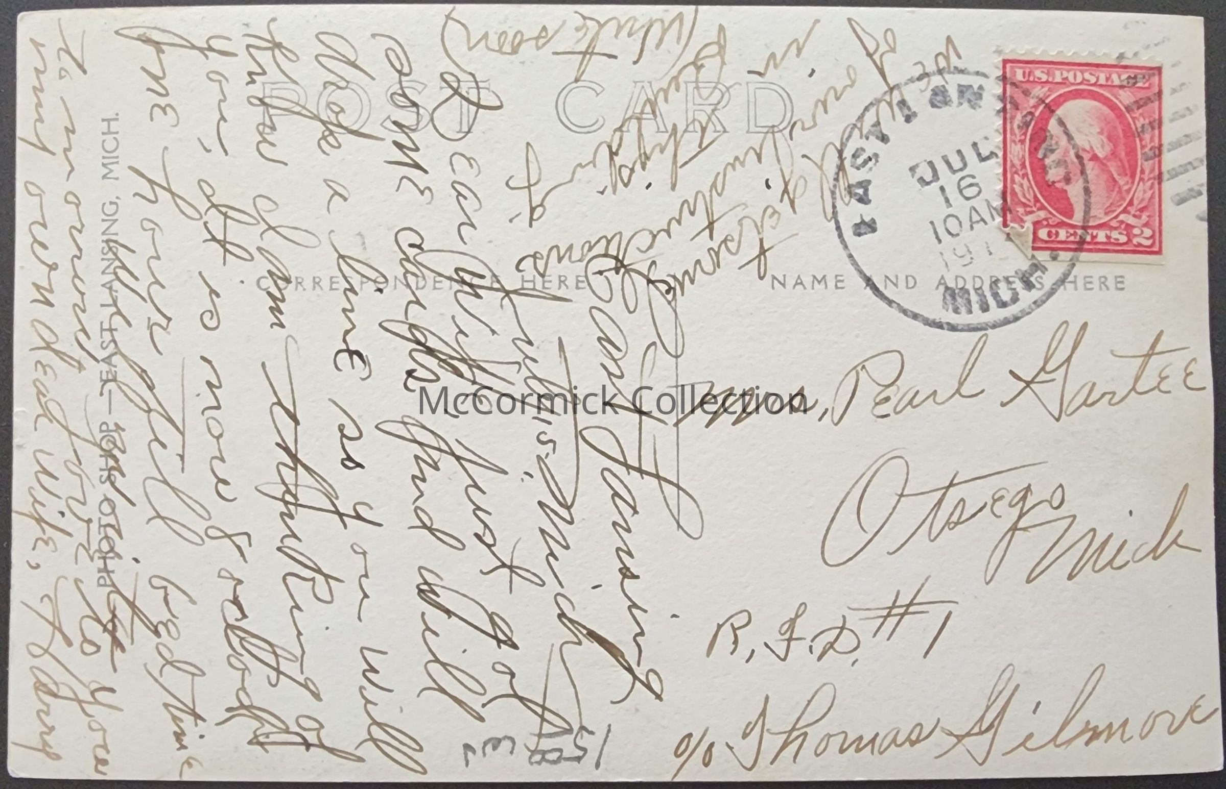 Real photo postcard of the R.E. Olds Hall of Engineering at Michigan Agricultural College in East Lansing, Michigan. Postally used.