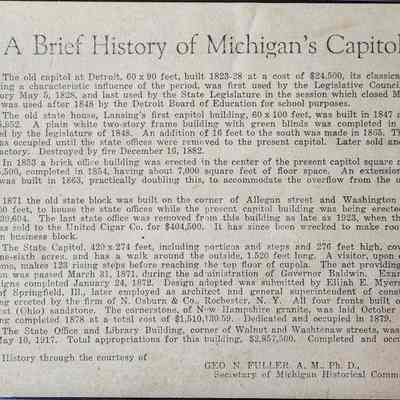 Photograph of the Michigan State Capitol by Lansing photographer M.F. Larner. Back features a history of the Capitol by George Fuller.