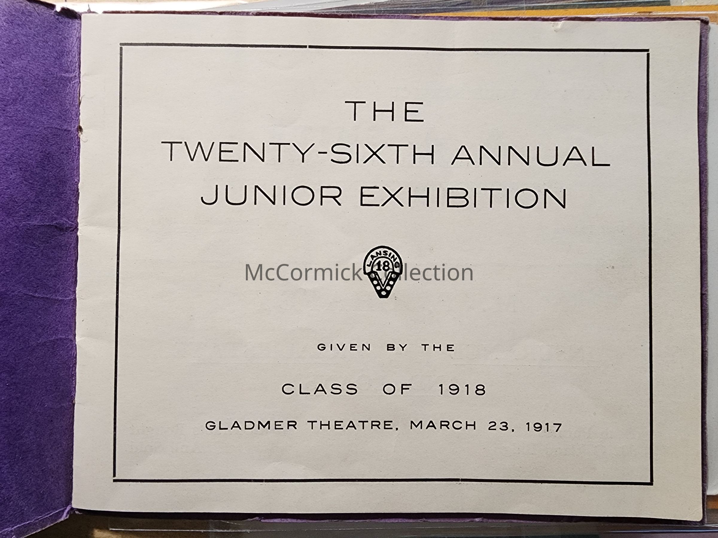 Small booklet with purple cover from the 26th Annual Junior Exhibition Given by the Class of 1918, Gladmer Theatre, March 23, 1917. Lansing High School event. Advertising throughout.