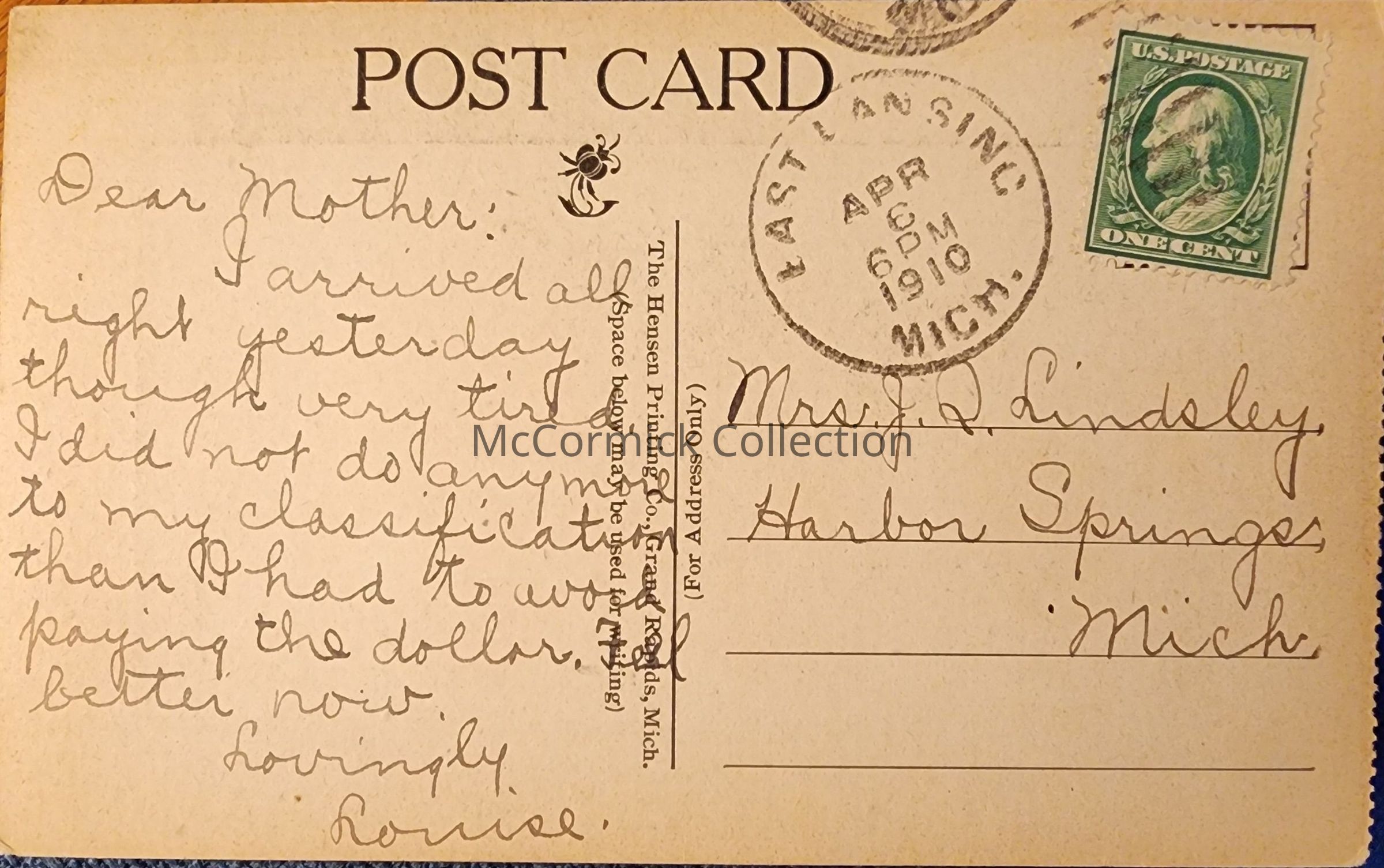 Postally used, East Lansing 1910 postmark.