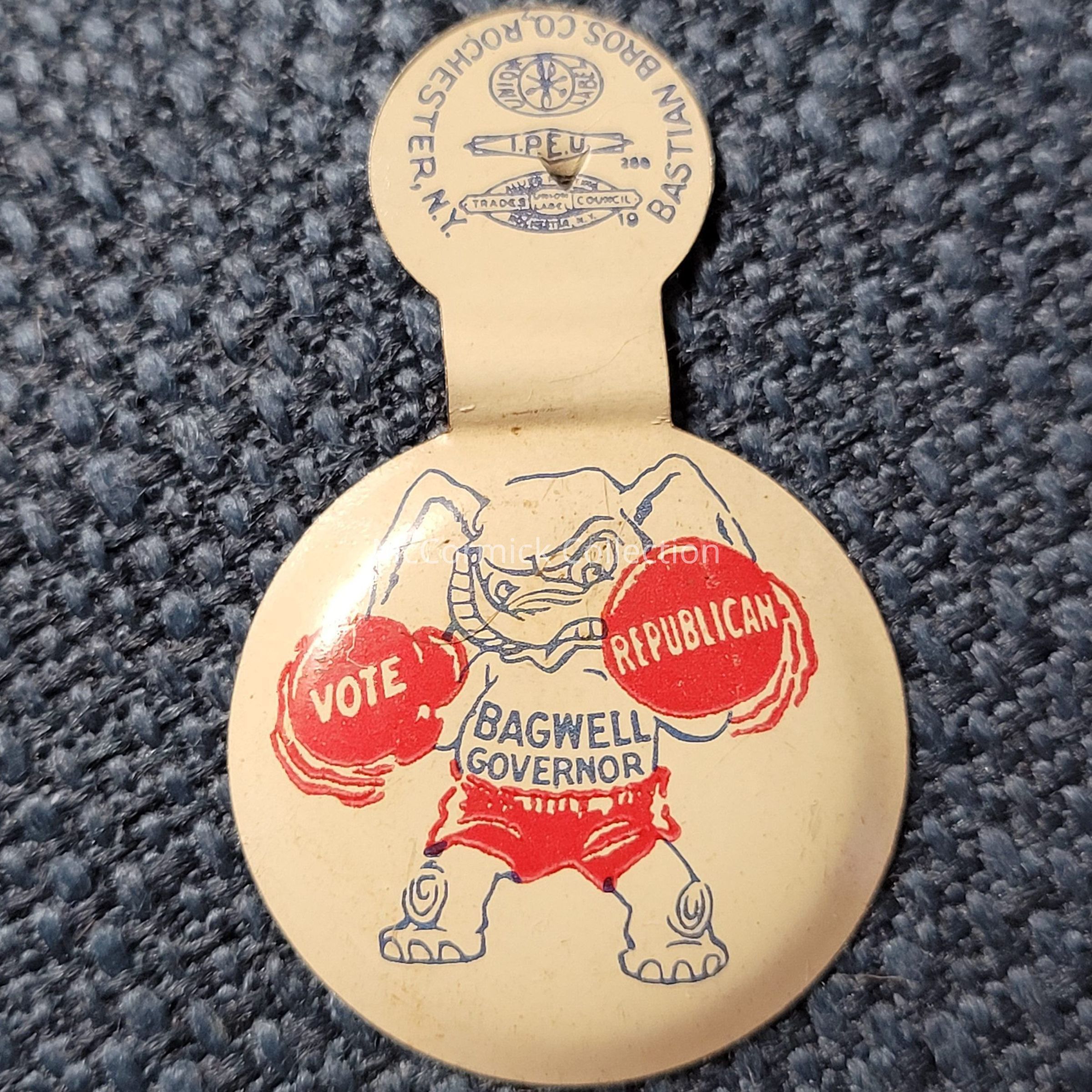 A red, white, and blue boxing elephant tab with the slogans "Vote Republican" and "Bagwell Governor." Circa 1960.