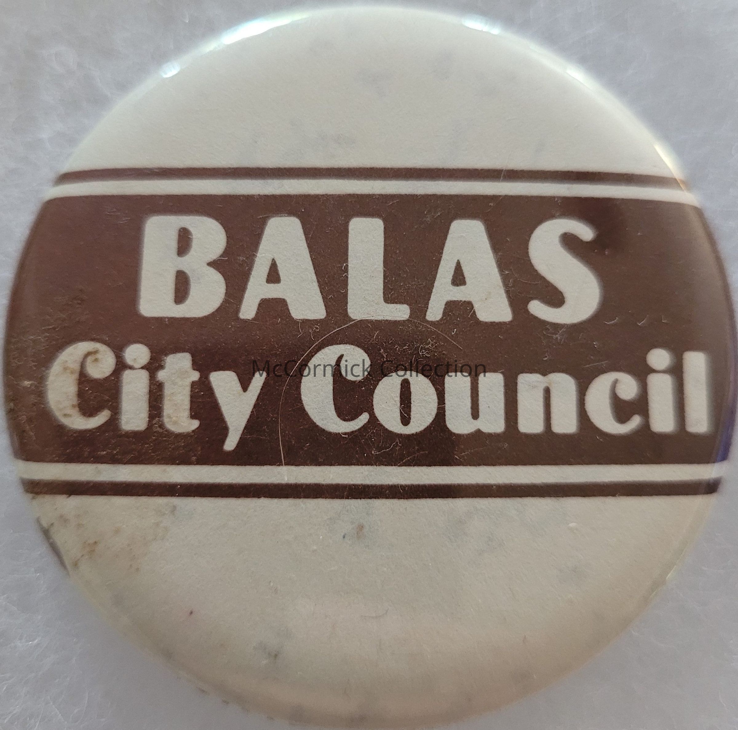 Brown and white, 2.25", political button for Balas for Lansing City Council. Kingdon Collection.