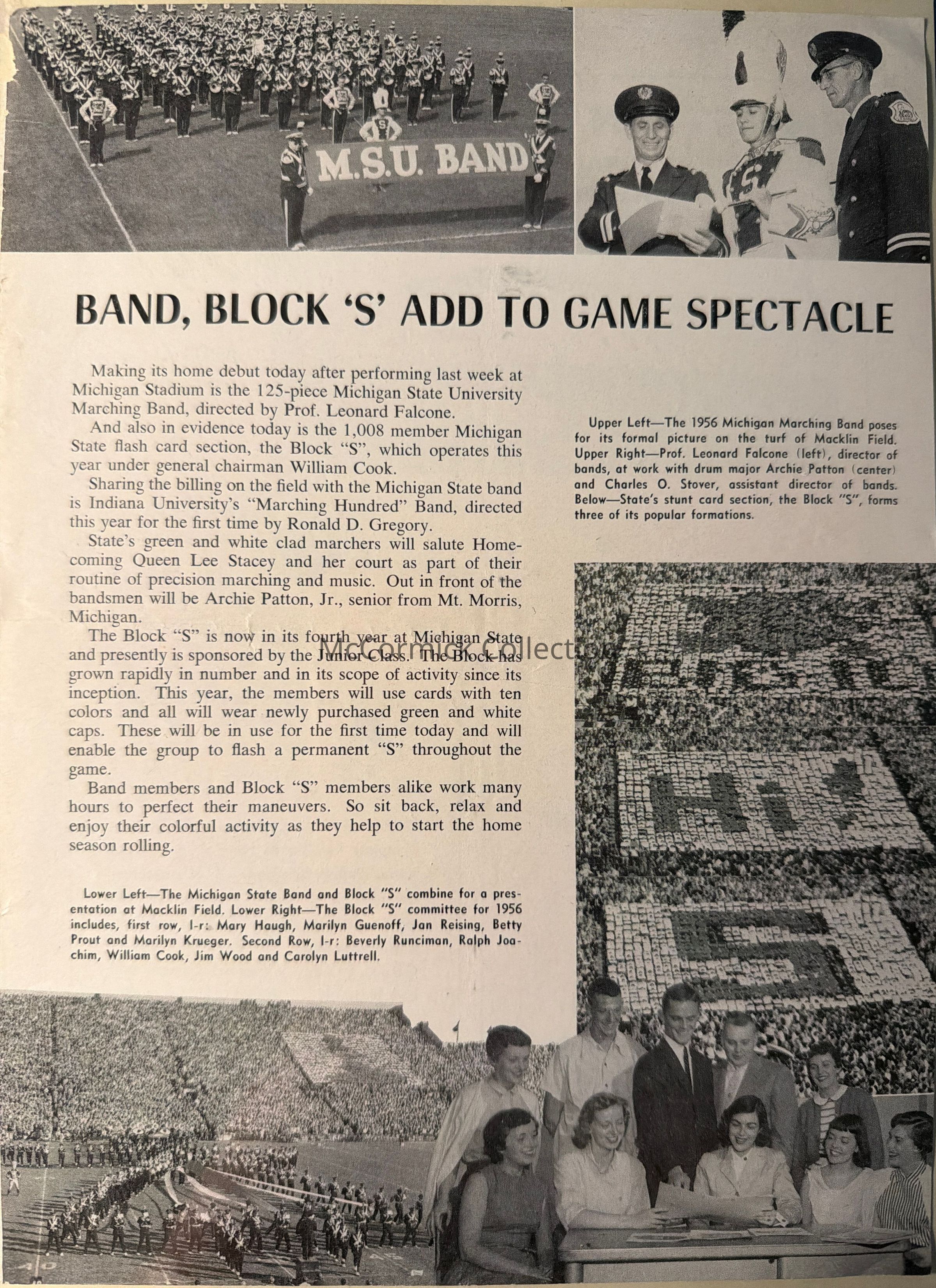 Spartan Marching Band program page removed from MSU football program. Shows directors Leonard Falcone and Oscar Stover, c. 1950s. From the Charles Ross collection.