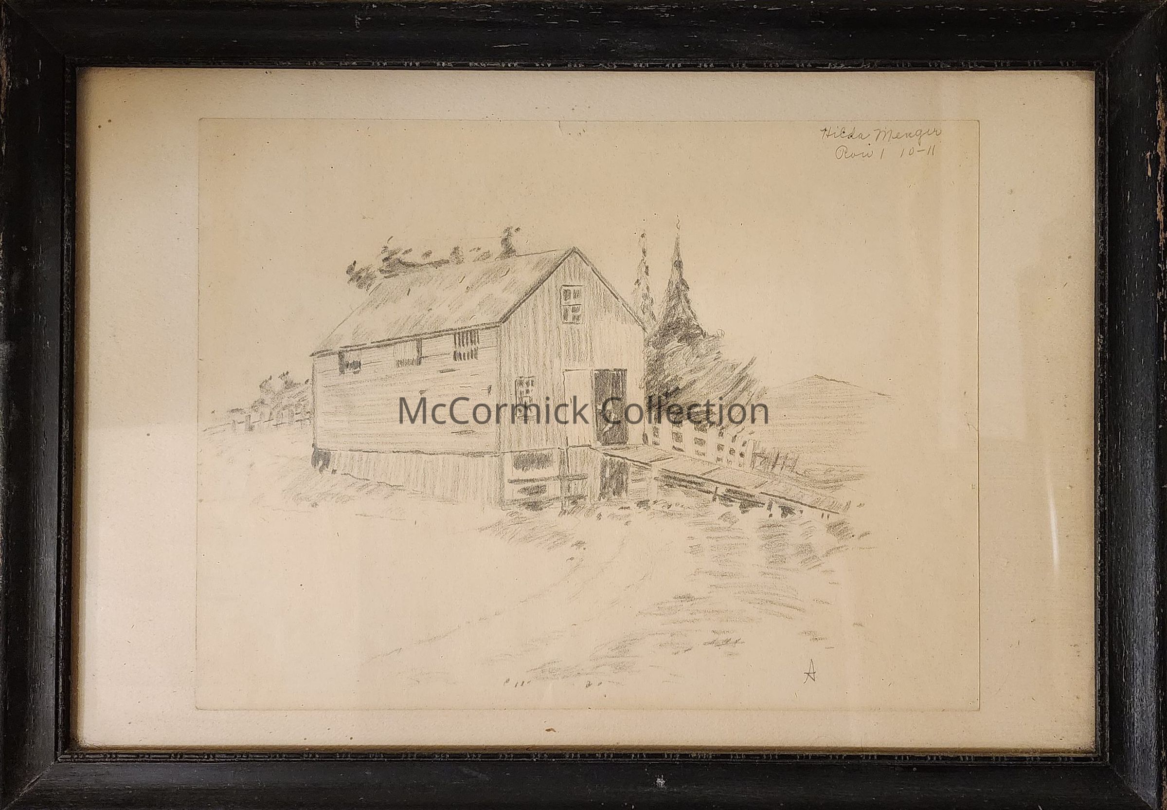 A framed drawing of a barn by Hilda Menger of Holt. Likely done during her time as a student at the Gunn School in Holt.