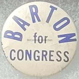 A blue and white political button for Barton for Congress, circa 1970s. Believed to be Bruce Barton's 1974 run for the 6th District of Michigan.
