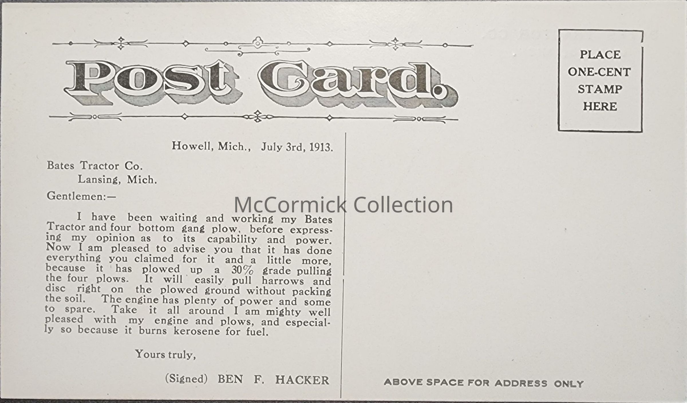 Advertising postcard for Bates Tractor Company of Lansing, Michigan. Dated 1913. Postally unused.