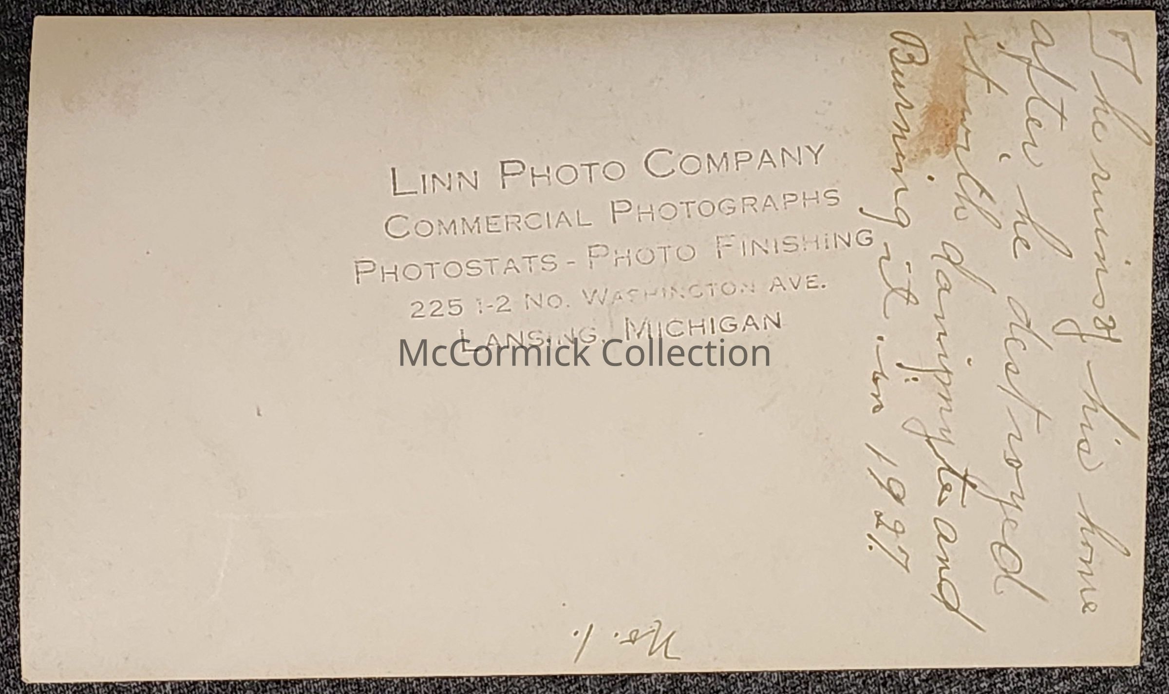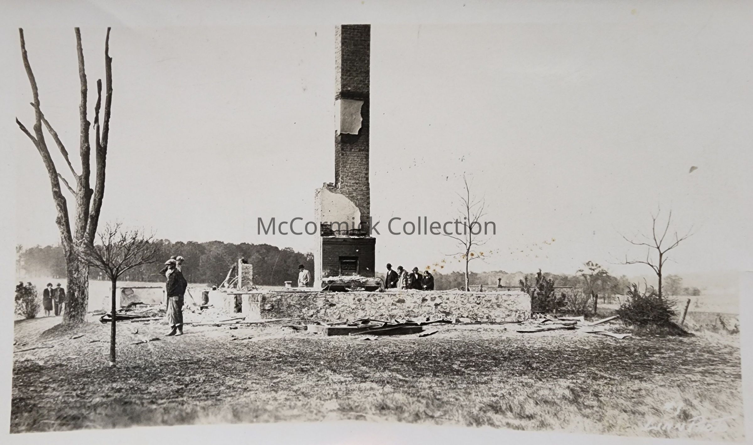 Photographic print of the ruins of the home of Andrew Keyhoe, perpetrator of the 1927 Bath School Bombing. He burned his home down before the school attack. Photo by Linn Photo Co. of Lansing, No. 1. Caption written on back.