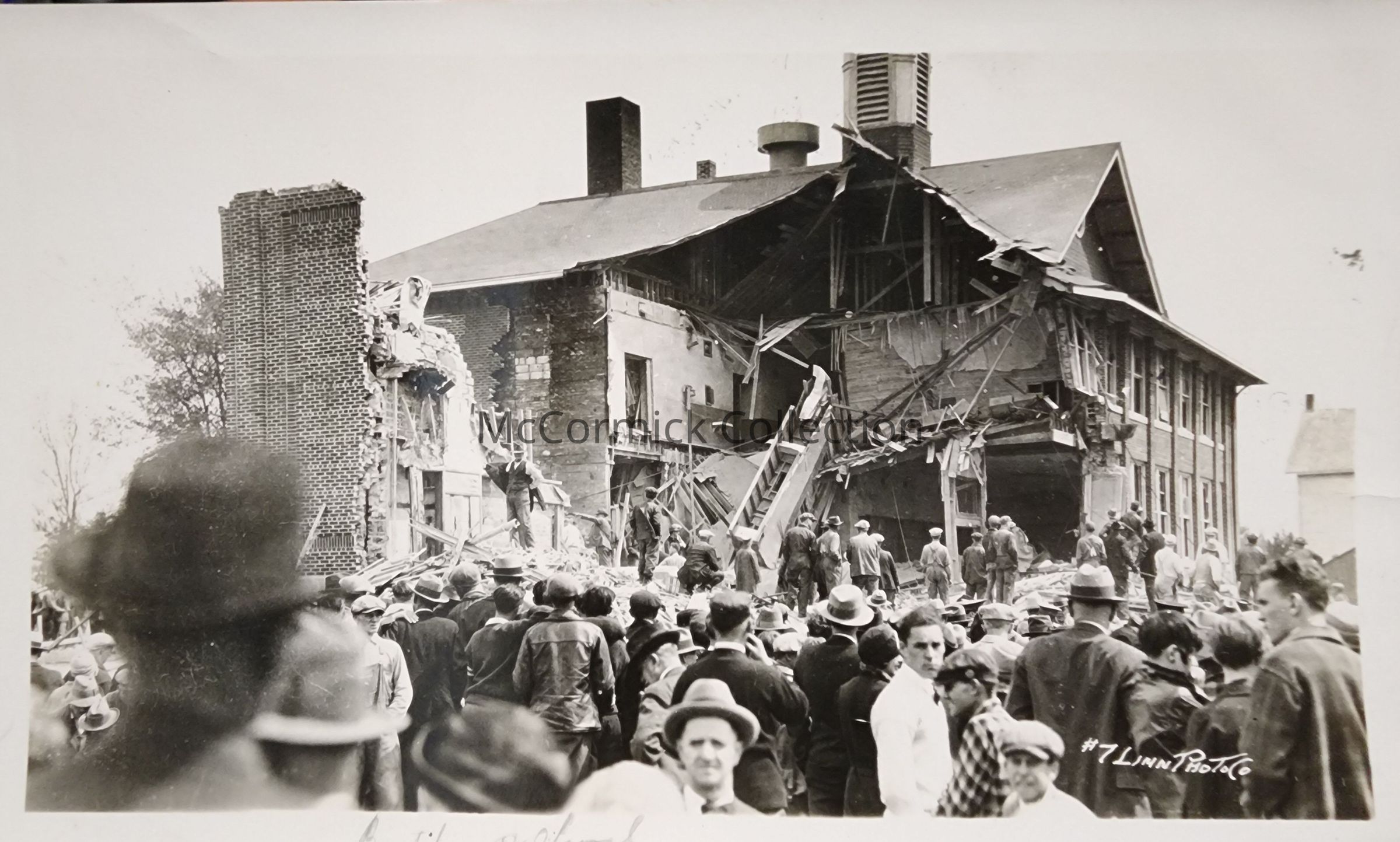 Photographic print of the ruins of the Bath School following the infamous bombing in 1927. This image shows the School building and the crowd of onlookers. Photo by Linn Photo Co. of Lansing, labeled as #7 of a series, the back though numbers it as No. 2.