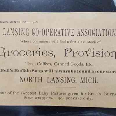 A trade card from the Lansing Co-Operative Association of Groceries and Provisions in North Lansing. Bell's Buffalo Soap wrapper advertising.